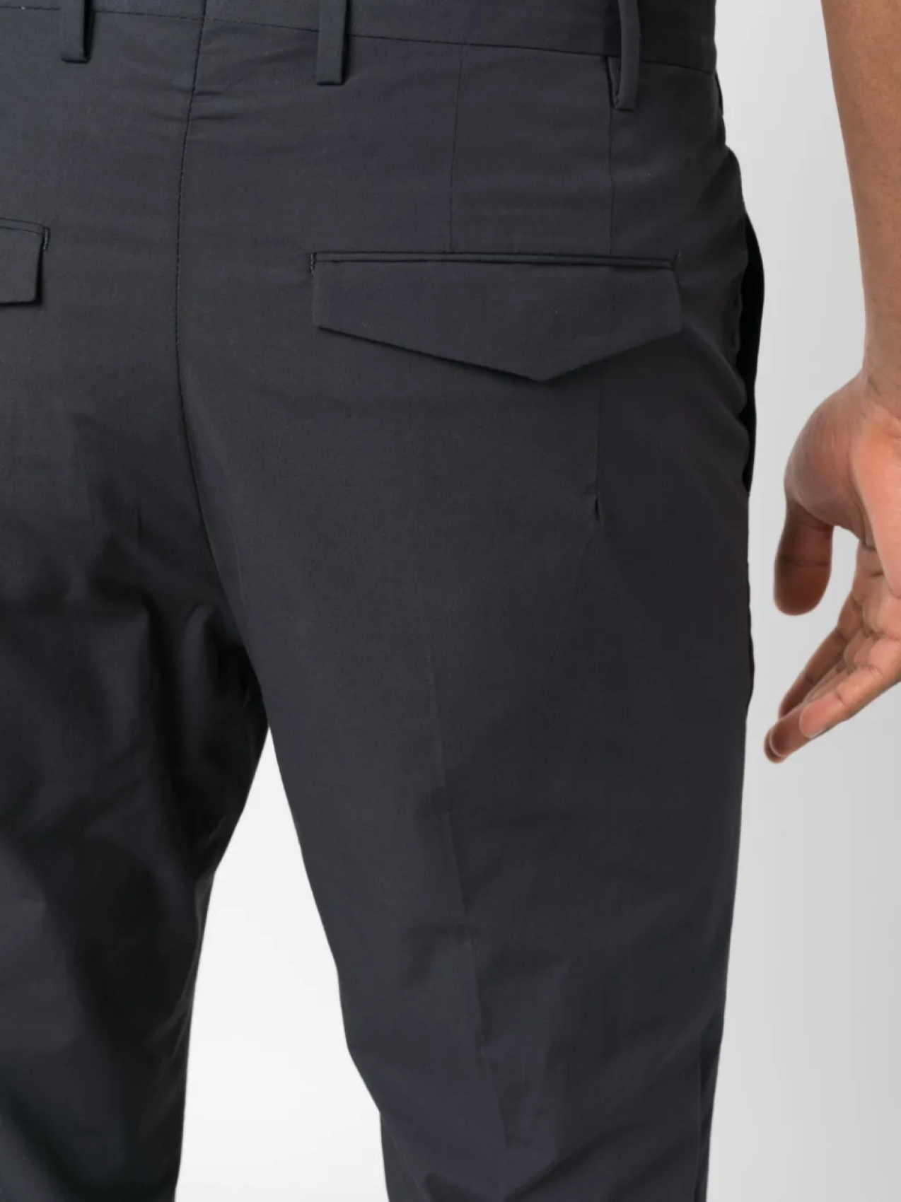 Черный, эластичный хлопок, петли для ремня, смещенная застежка спереди, прямой крой, два прорезных кармана по бокам и два кармана с клапанами сзади.