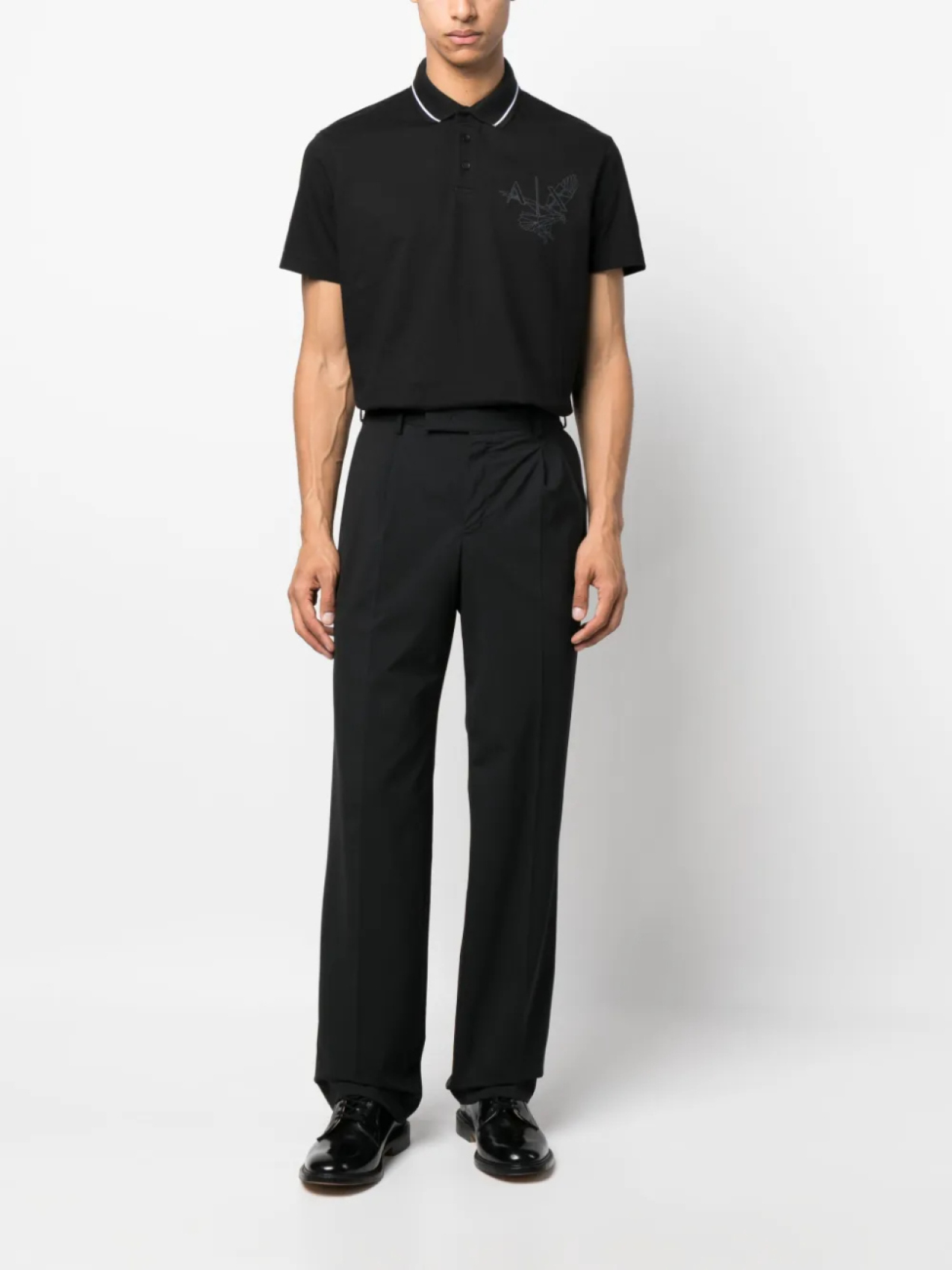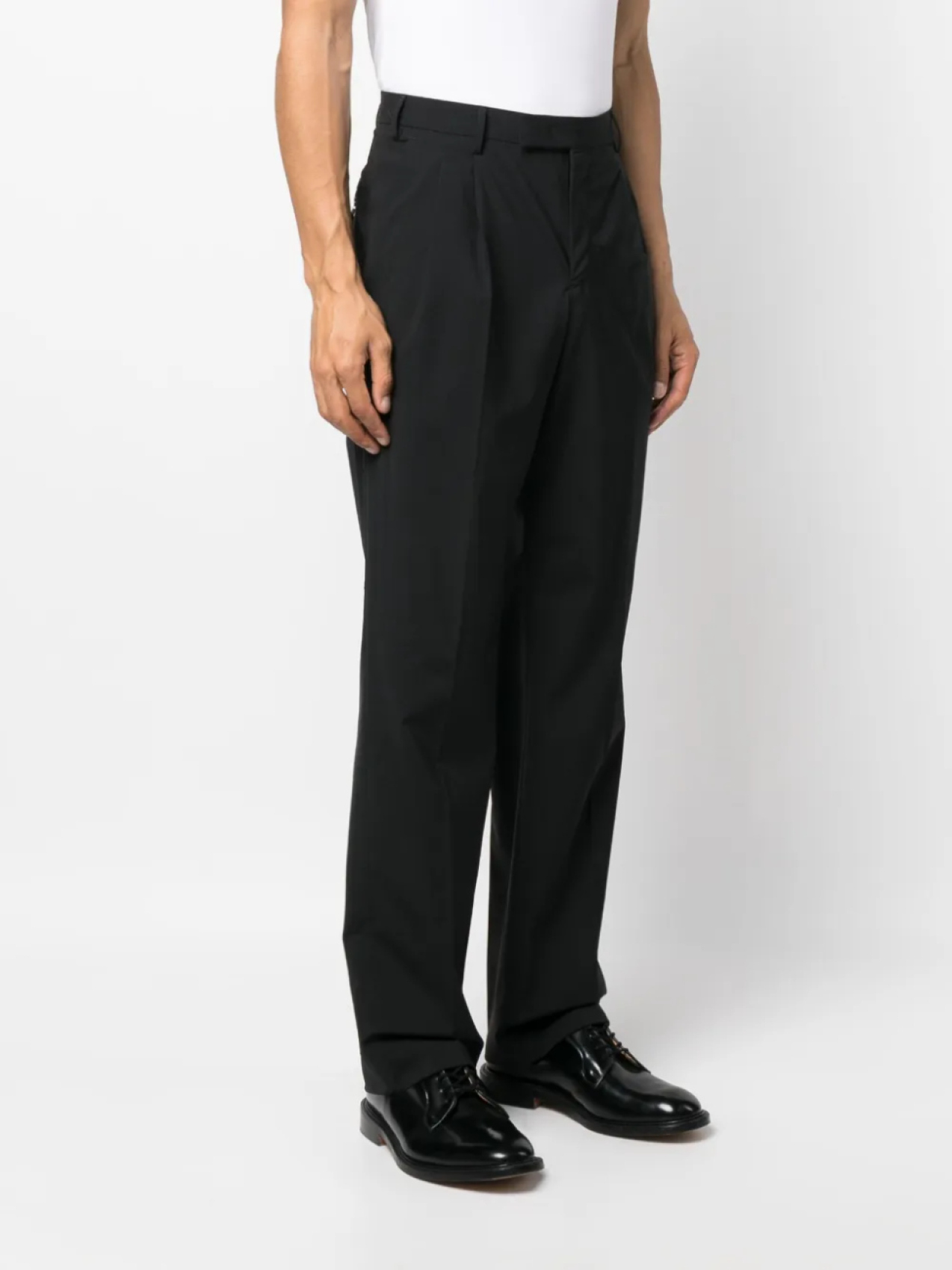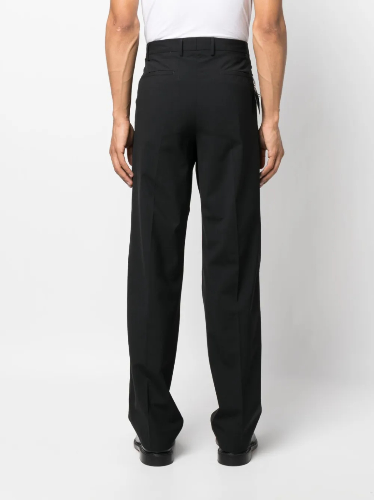 Черный, смесовая необработанная шерсть, складки, крепление для ключей, прямой крой, завышенная талия, потайная застежка на молнии и пуговицах, петли для ремня, два прорезных кармана по бокам, два кармана с листочкой сзади и стрелки.