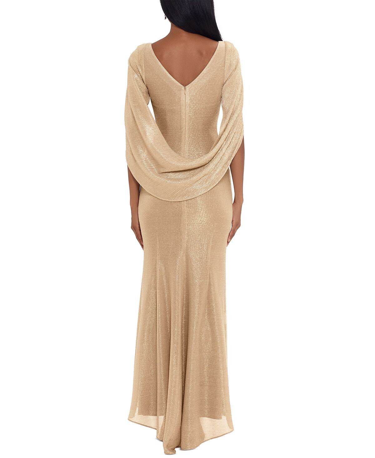 Миниатюрное вечернее платье в пол с мерцающим металлизированным узором от Betsy & Adam с рукавами в стиле накидки, ниспадающими на спину. Этот потрясающий силуэт заставит вас заявить о себе независимо от того, являетесь ли вы матерью жениха/невесты или гостем на свадьбе.