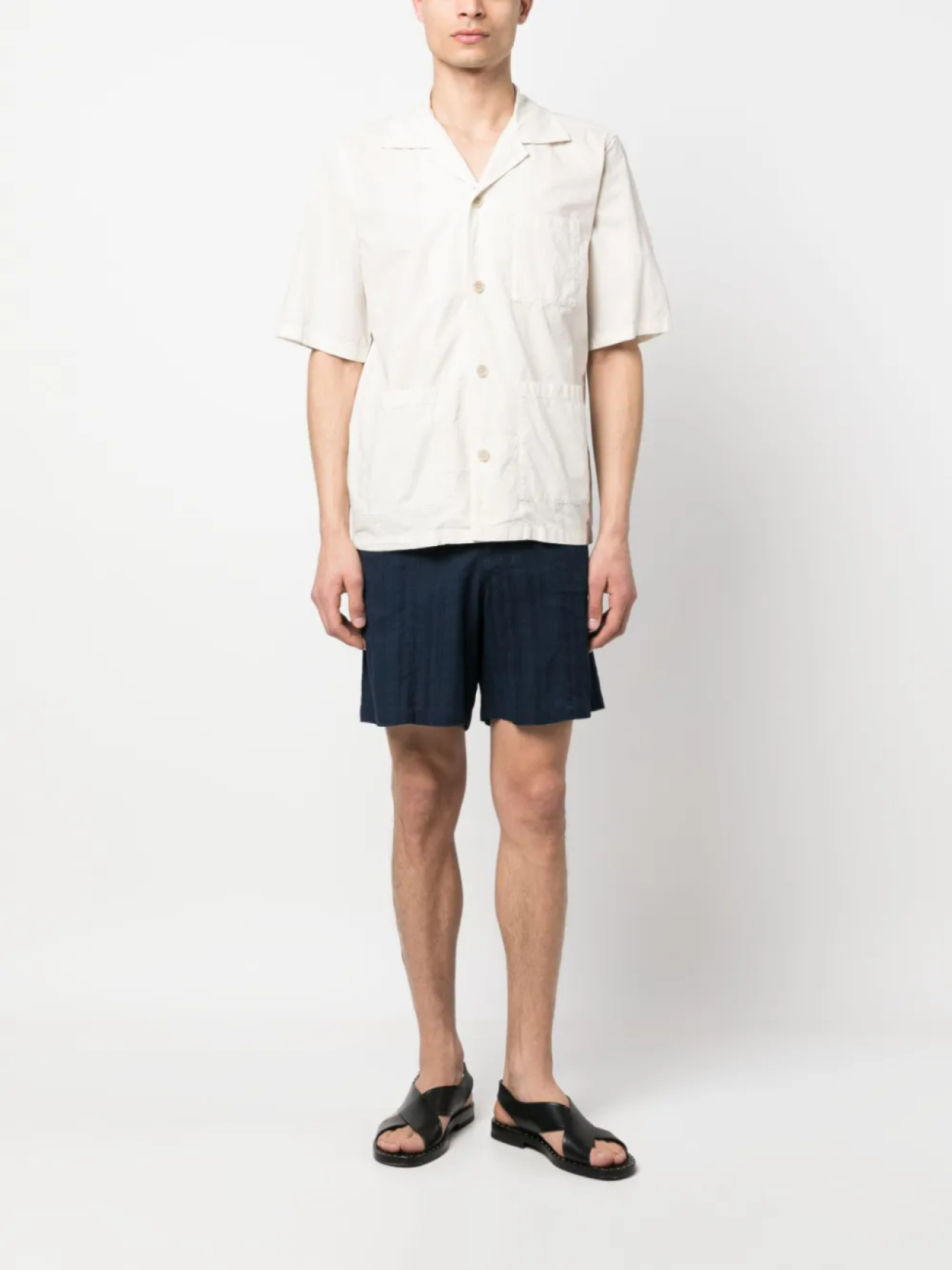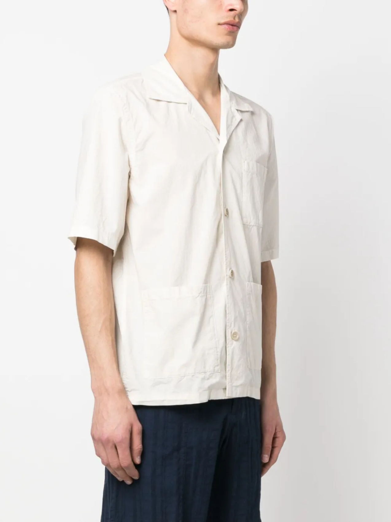Кремовый, хлопок, зазубренный воротник, застежка на пуговицах спереди, короткие рукава, нагрудный накладной карман, два накладных кармана спереди и прямой подол.