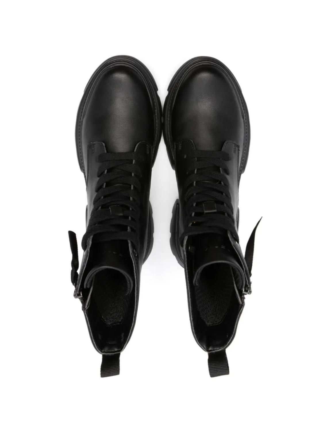 Черный, искусственная кожа, шнуровка спереди, закругленный носок, застежка на молнии сбоку, петля для подтягивания сзади и массивная резиновая подошва.