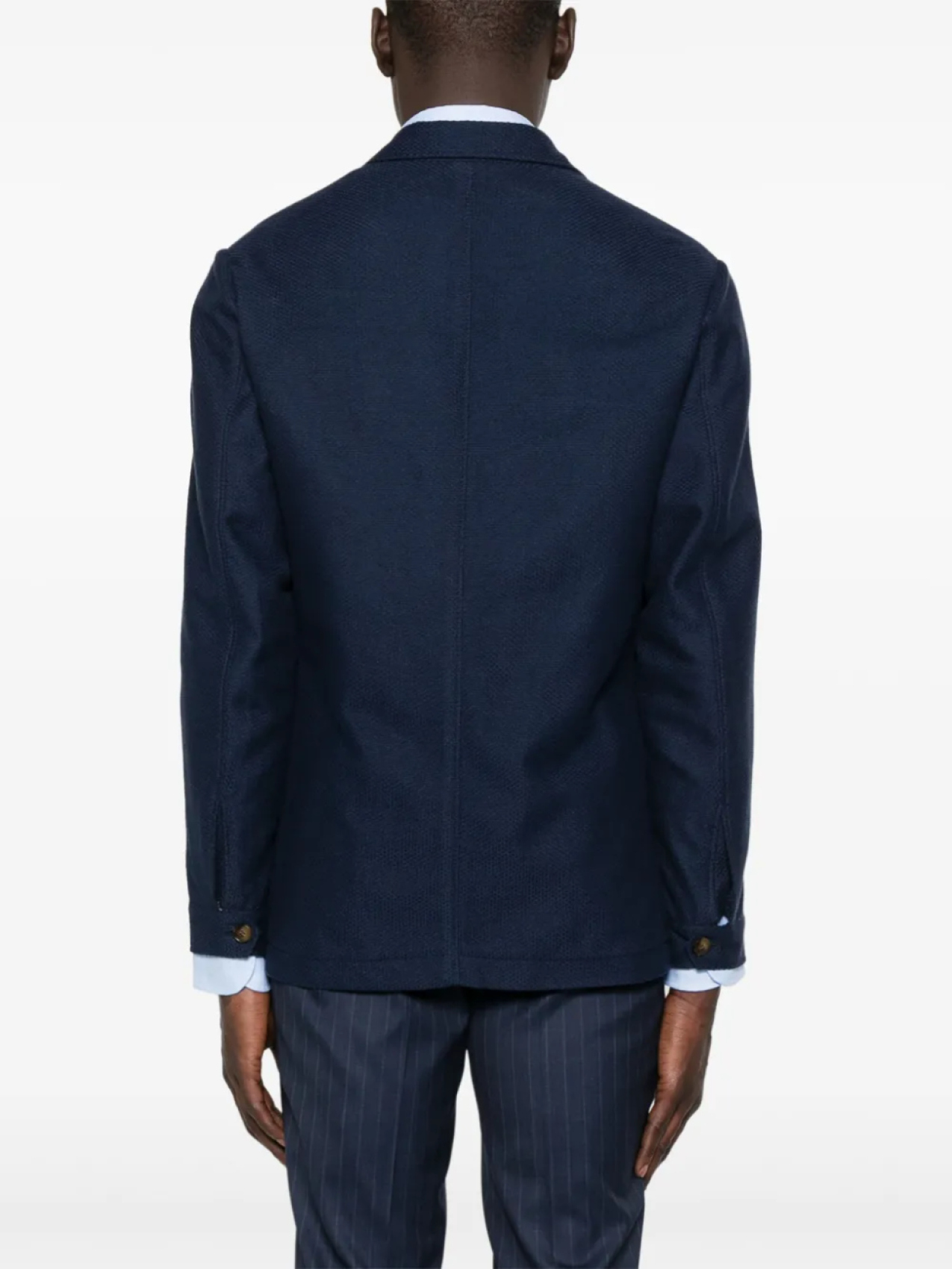 Темно-синяя застежка на пуговицы спереди, два кармана с клапанами спереди, манжеты на пуговицах, длинные рукава