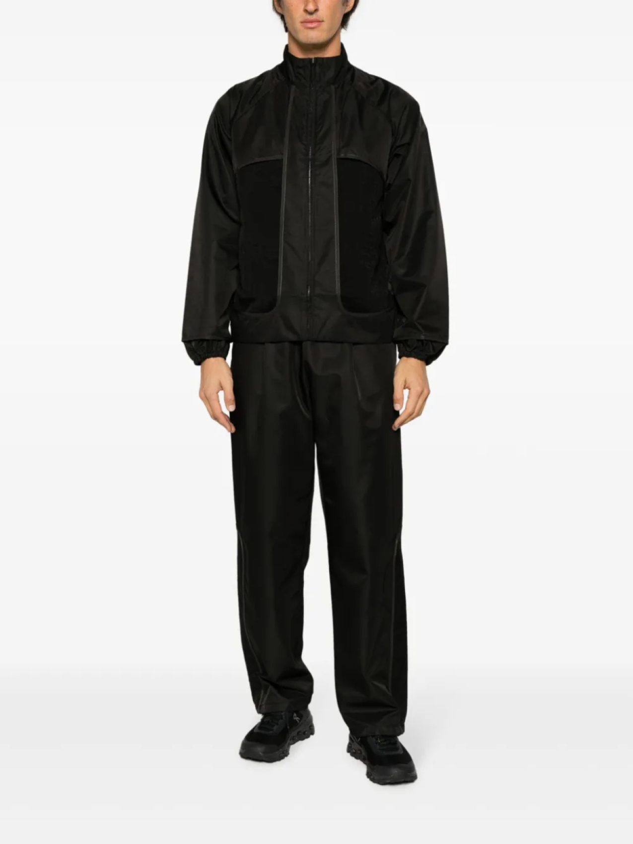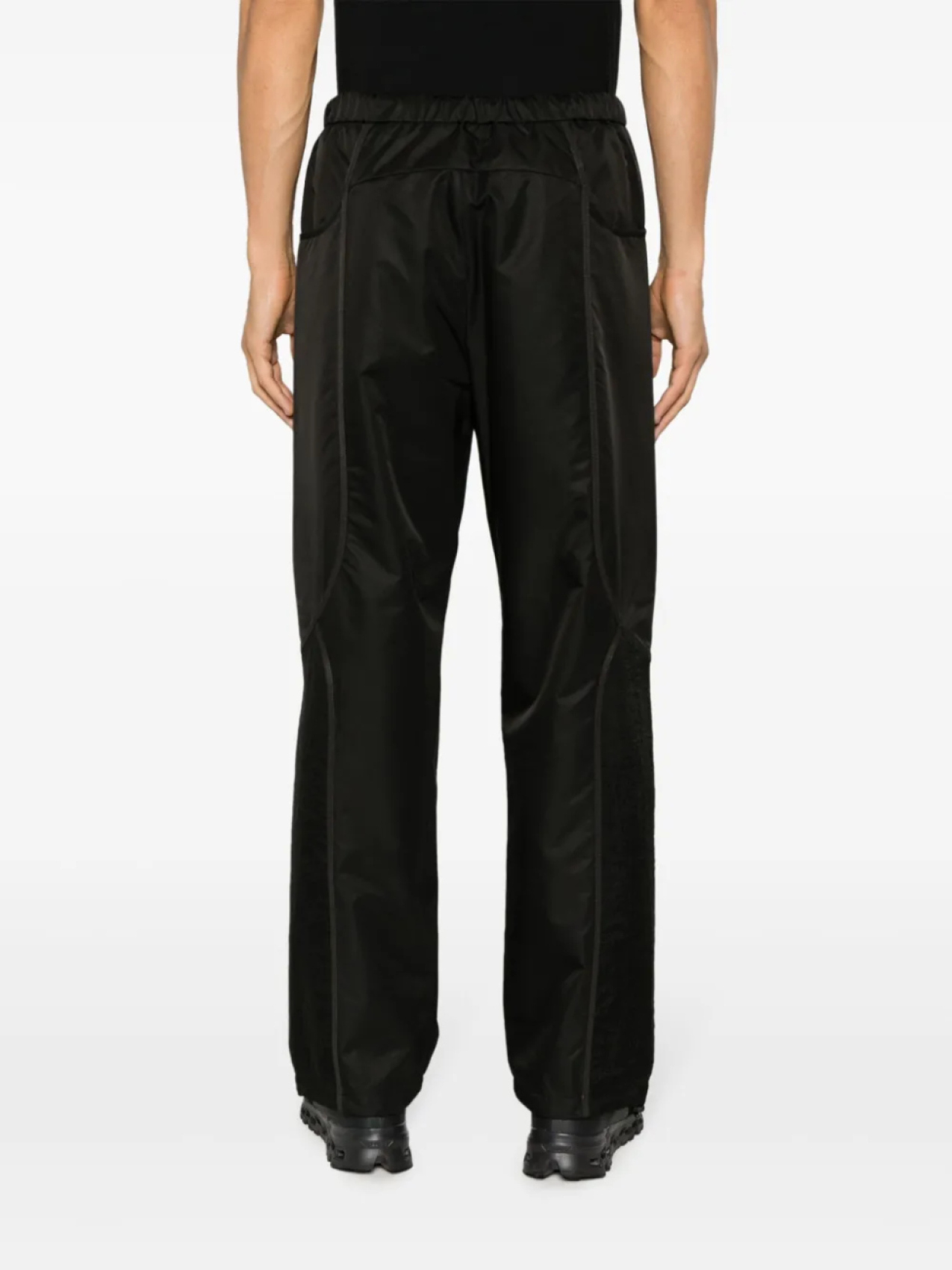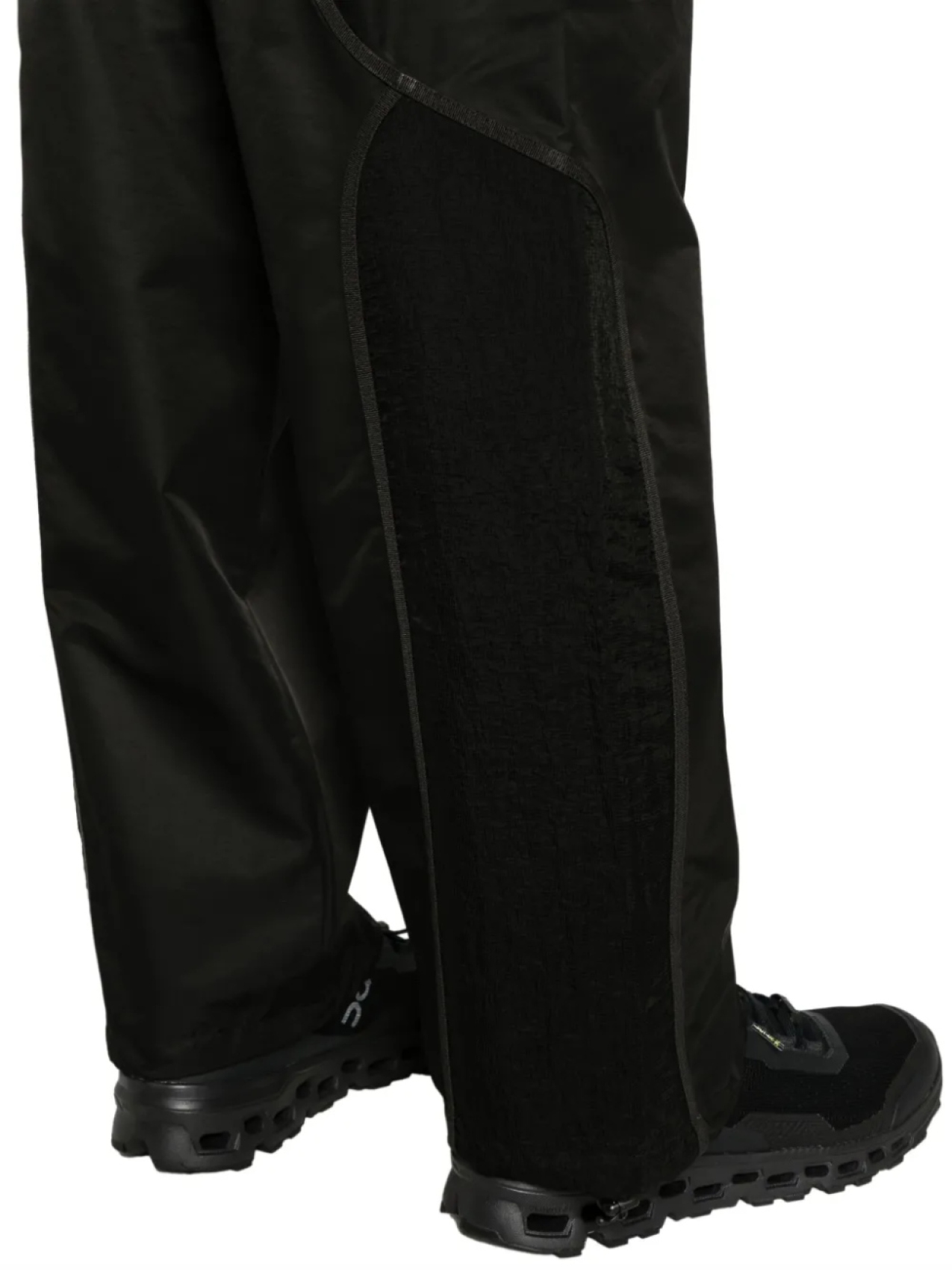 Черный, глянцевая фактура, вставки, складки, эластичный пояс, прямой крой, два накладных кармана сзади и прямой подол.