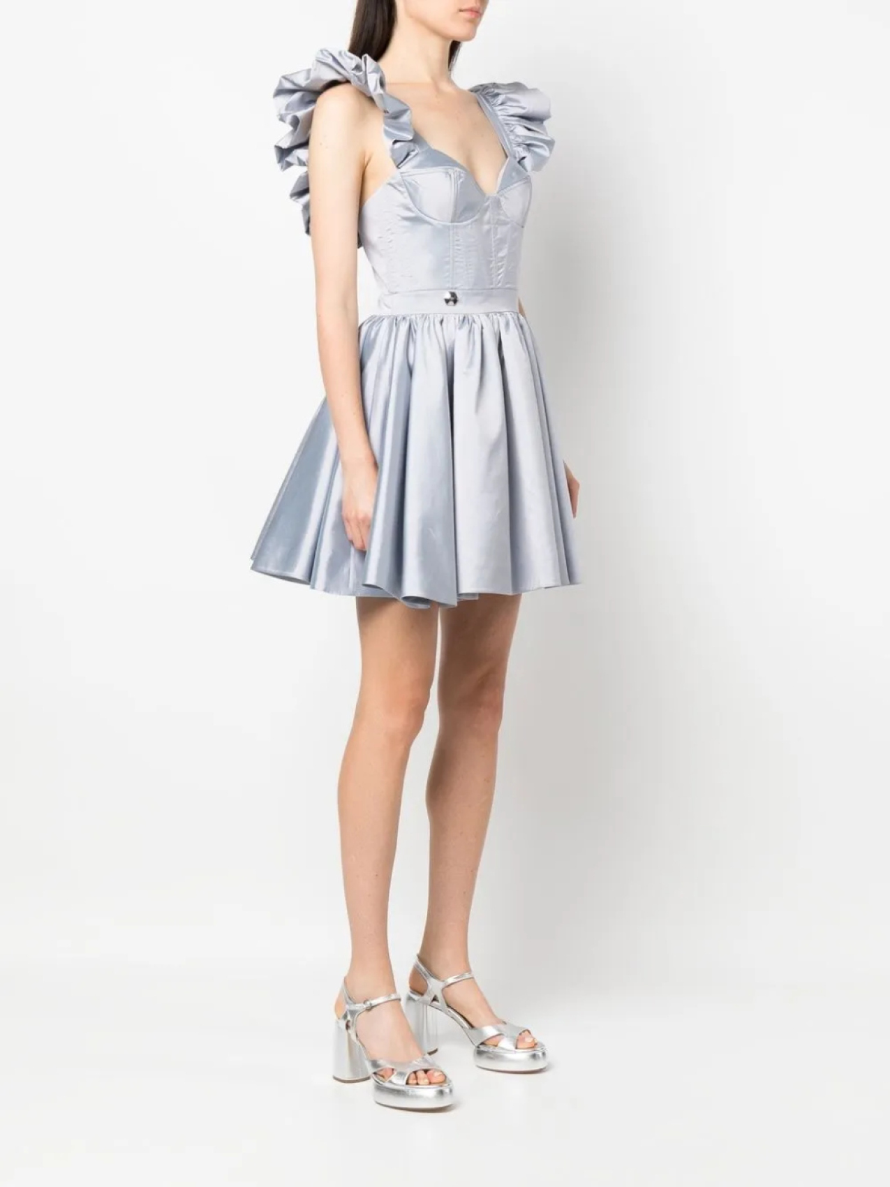 Лиловый, шелк, отделка с оборками, верх в корсетном стиле, серебристый металлический логотип, V-образный вырез, без рукавов, застежка на молнии сзади, расклешенная юбка, прямой подол и длина выше колена.