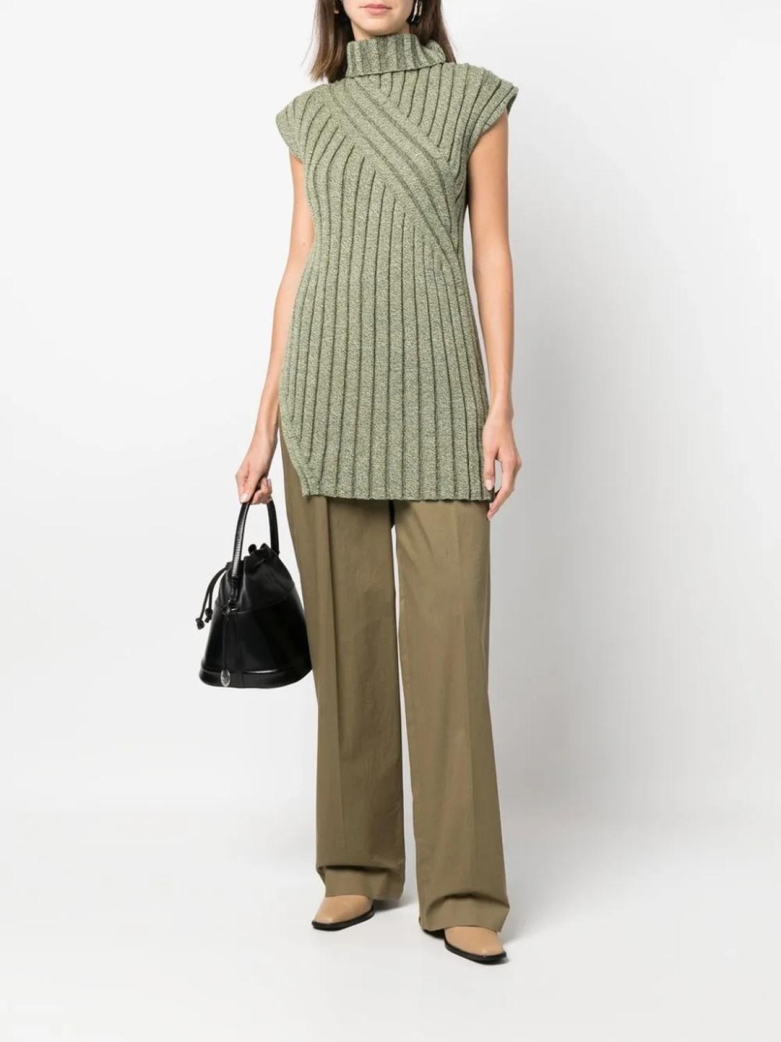 Хаки, смесовая шерсть, трикотаж в рубчик, высокий воротник, рукава кап и боковой разрез.
