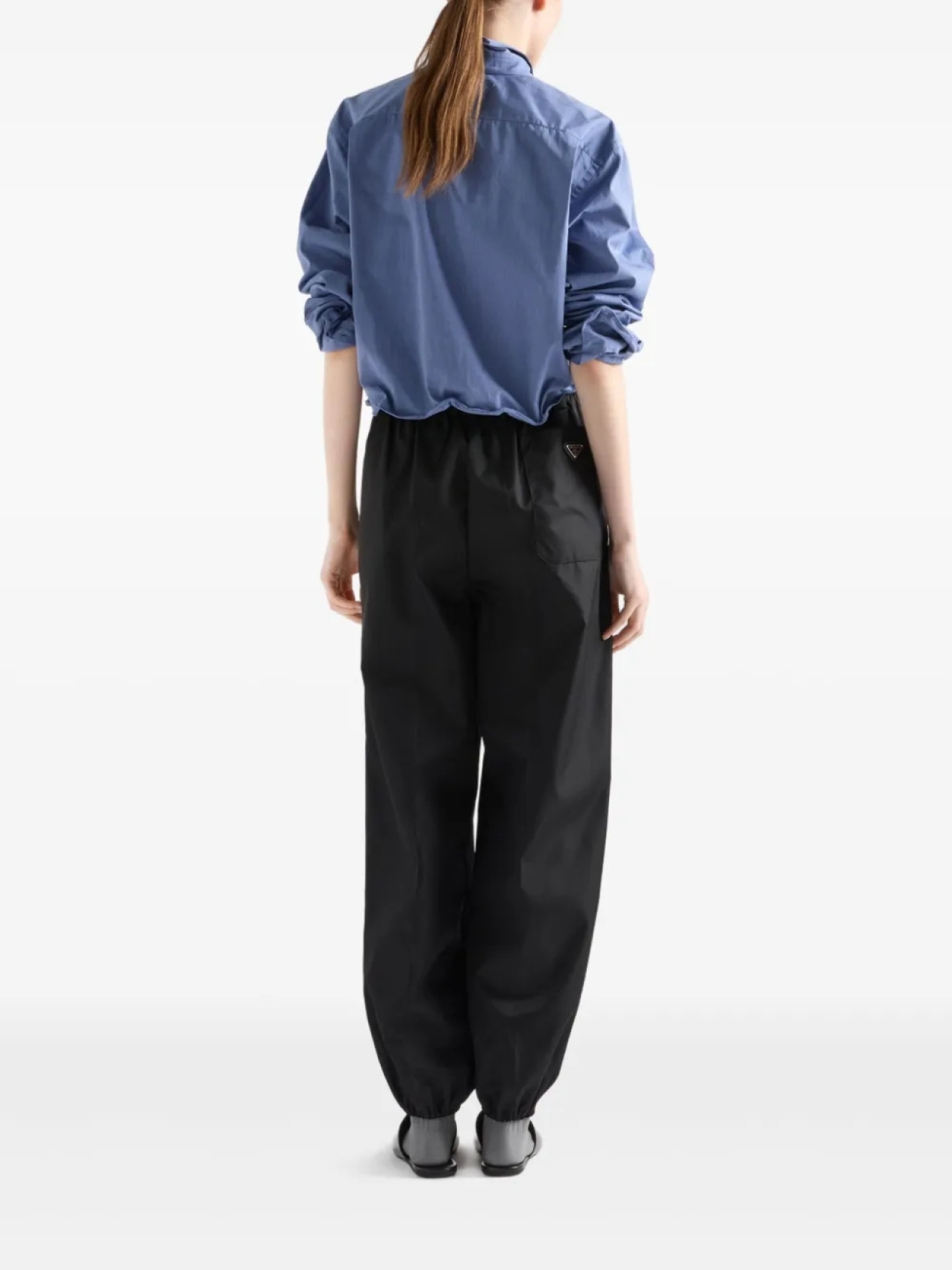Подробнее о товаре: • черный • застежка на молнию и крючок • эластичный пояс на шнурке • два прорезных кармана по бокам • эмалированный треугольный логотип Силуэт джоггеры Без подкладки Скрытая застежка на молнии Боковые карманы Эластичный манжеты Эмалированный металлический треугольный логотип Эластичный пояс с кулиской Накладной карман сзади Петли для ремня Нейлон