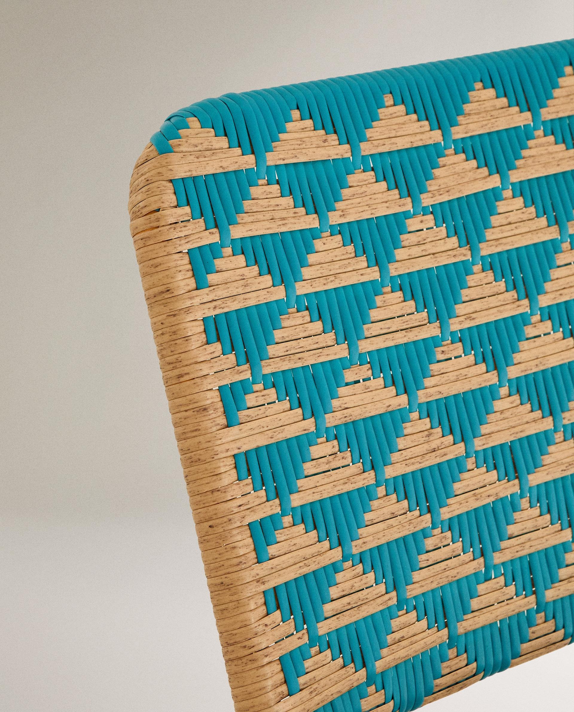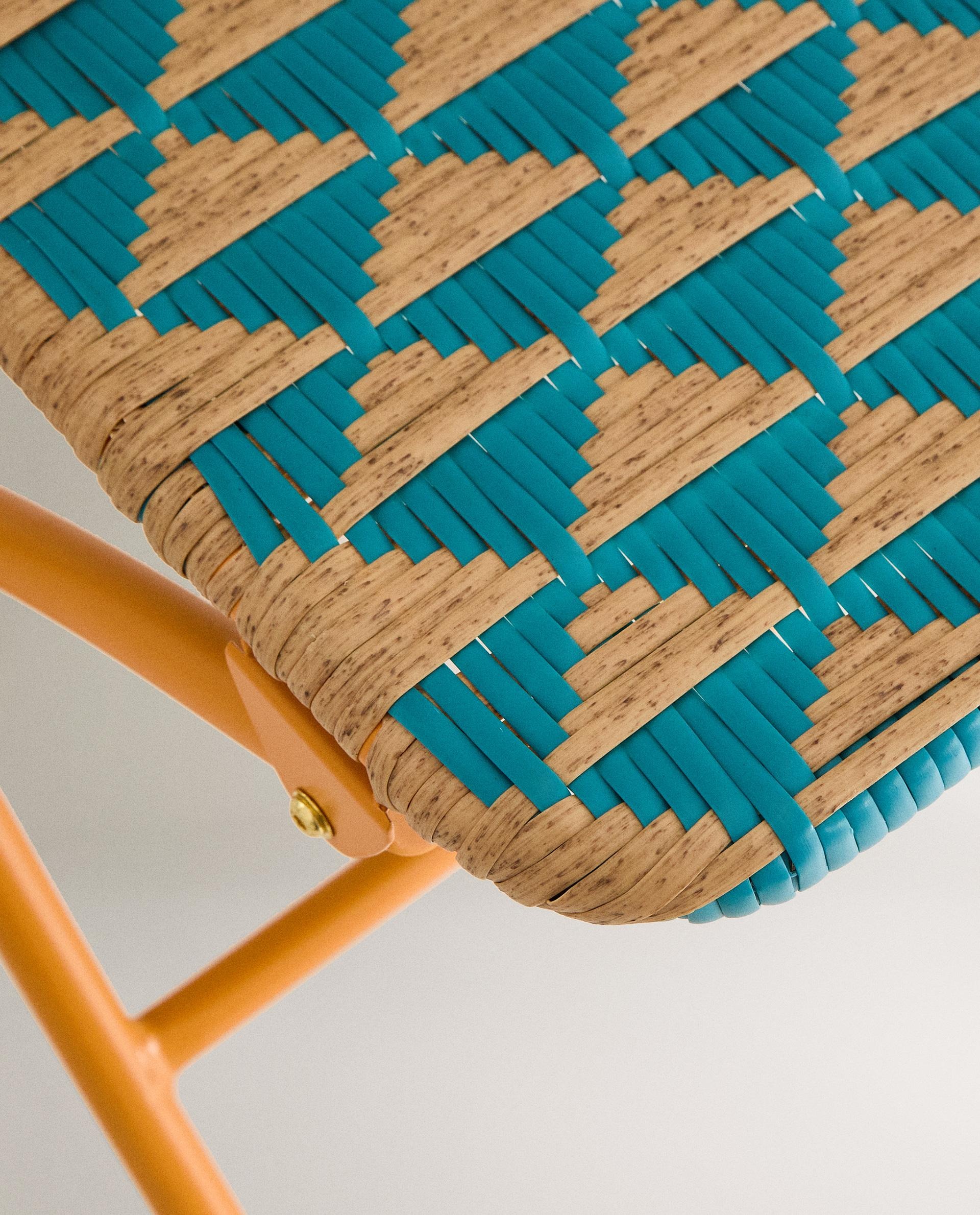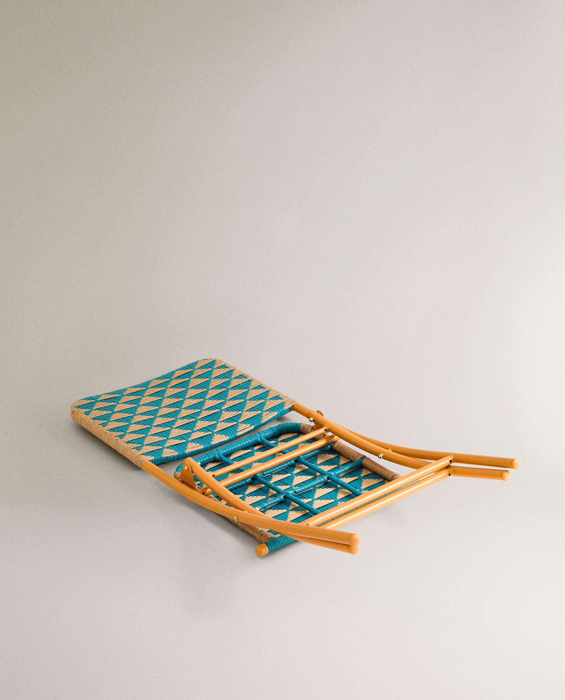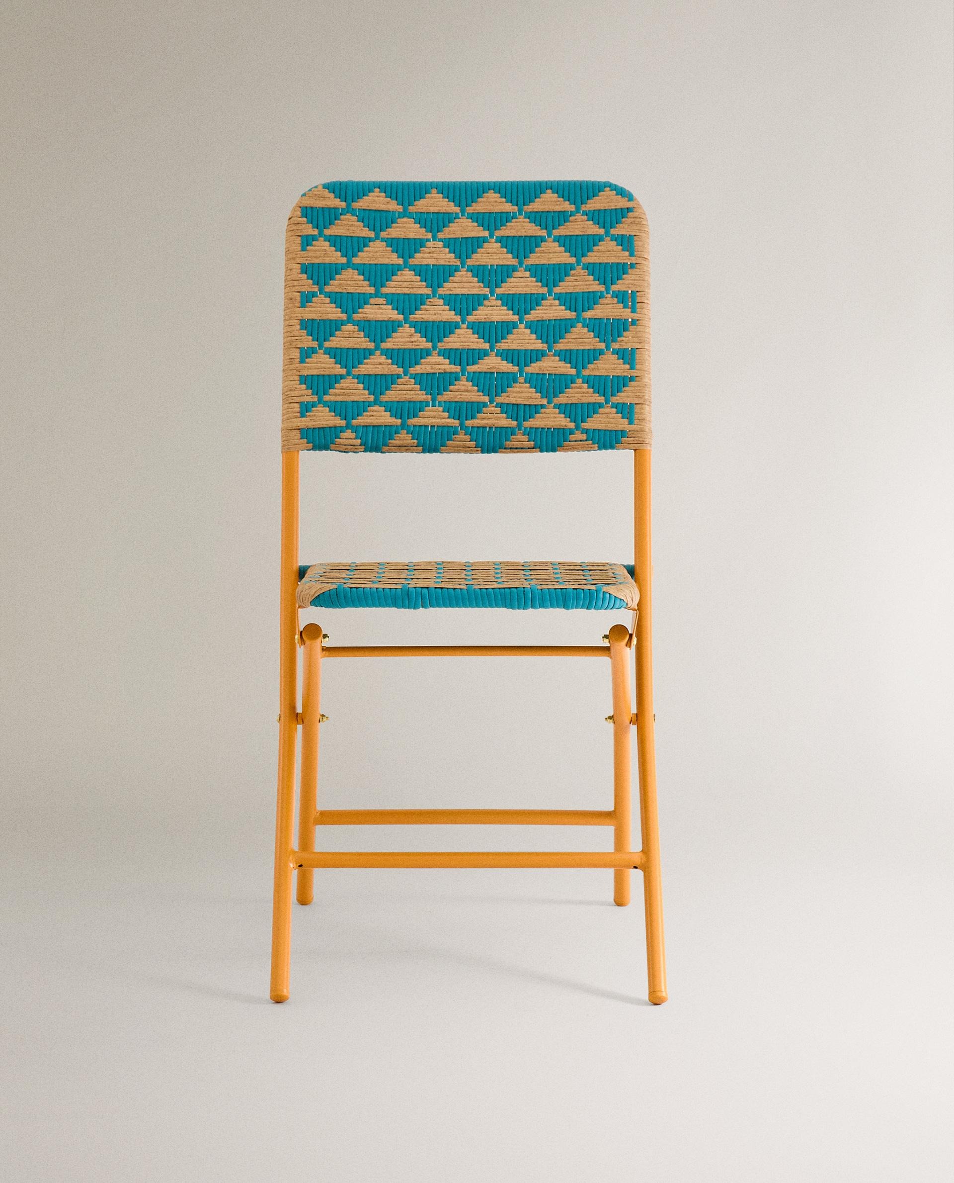 Складной стул с металлическим каркасом и двухцветной плетеной спинкой и сиденьем, образующими треугольники.