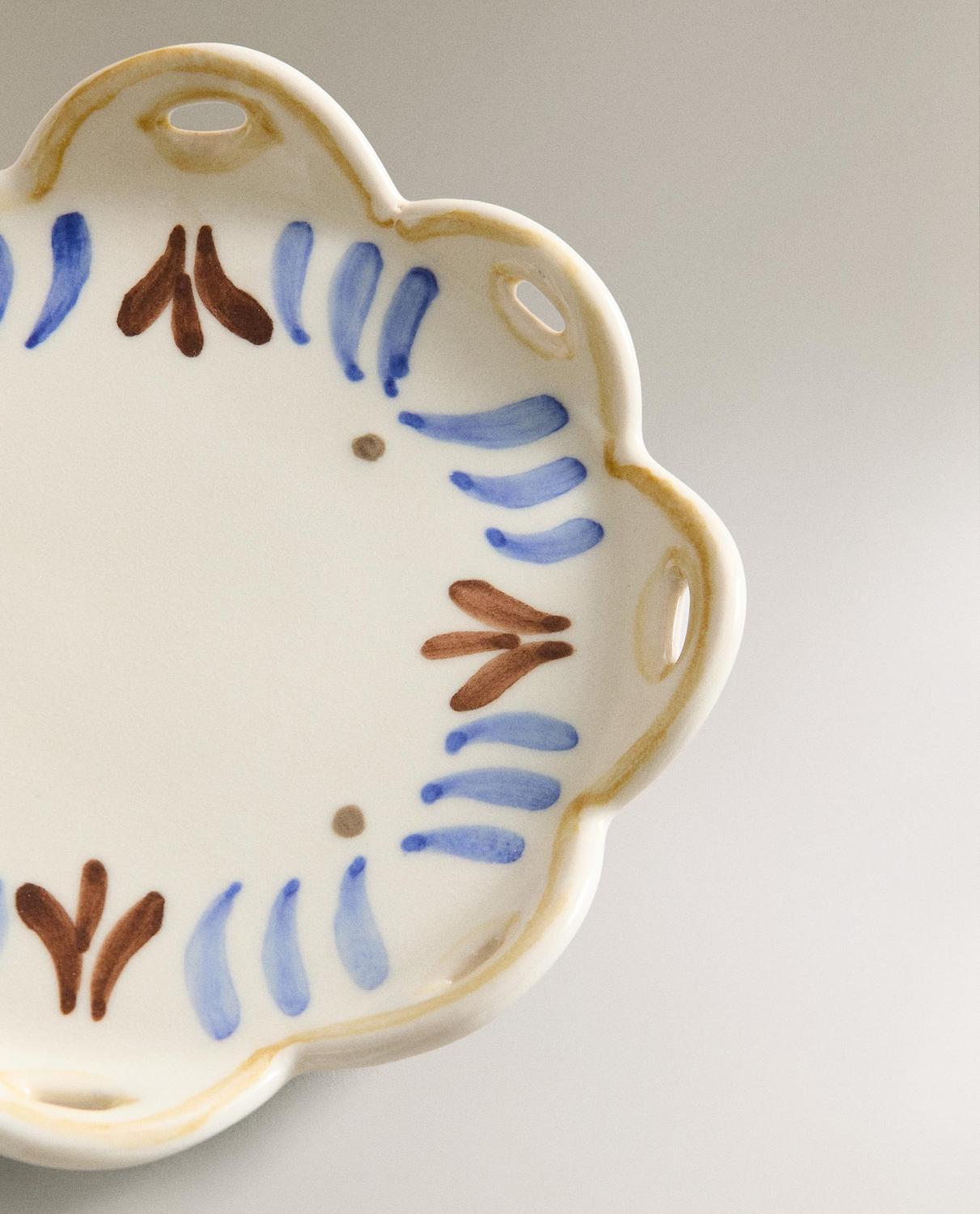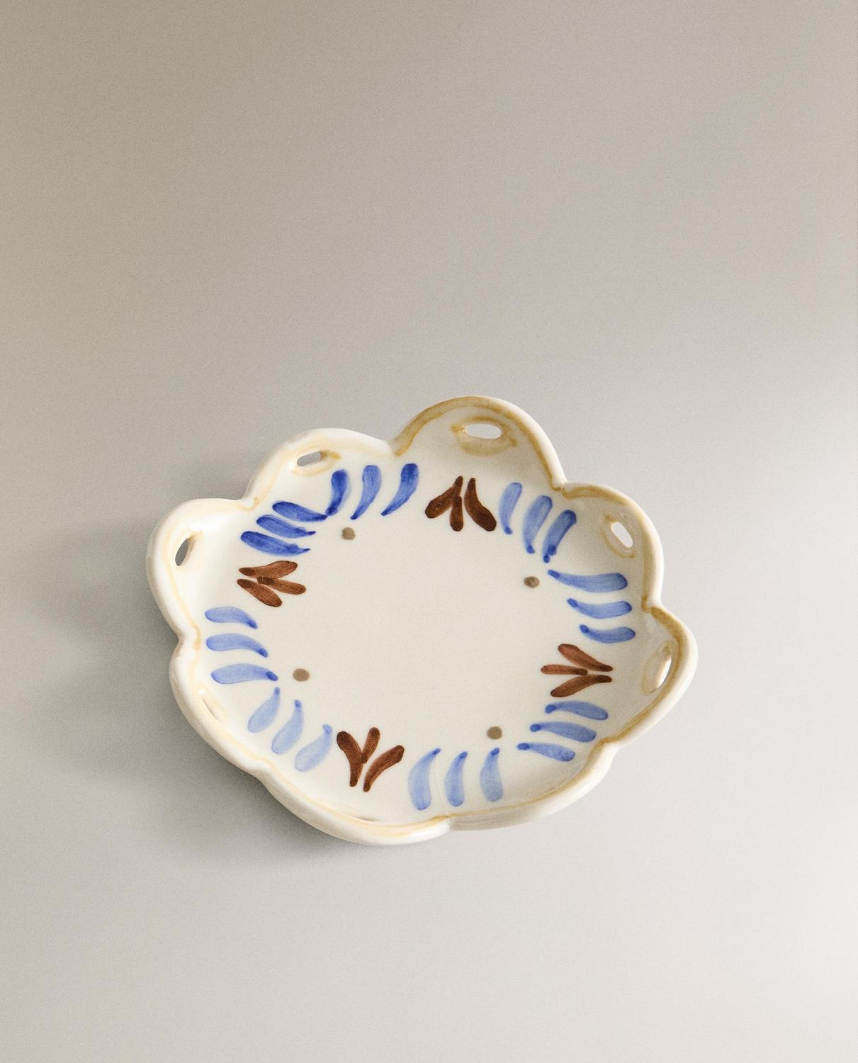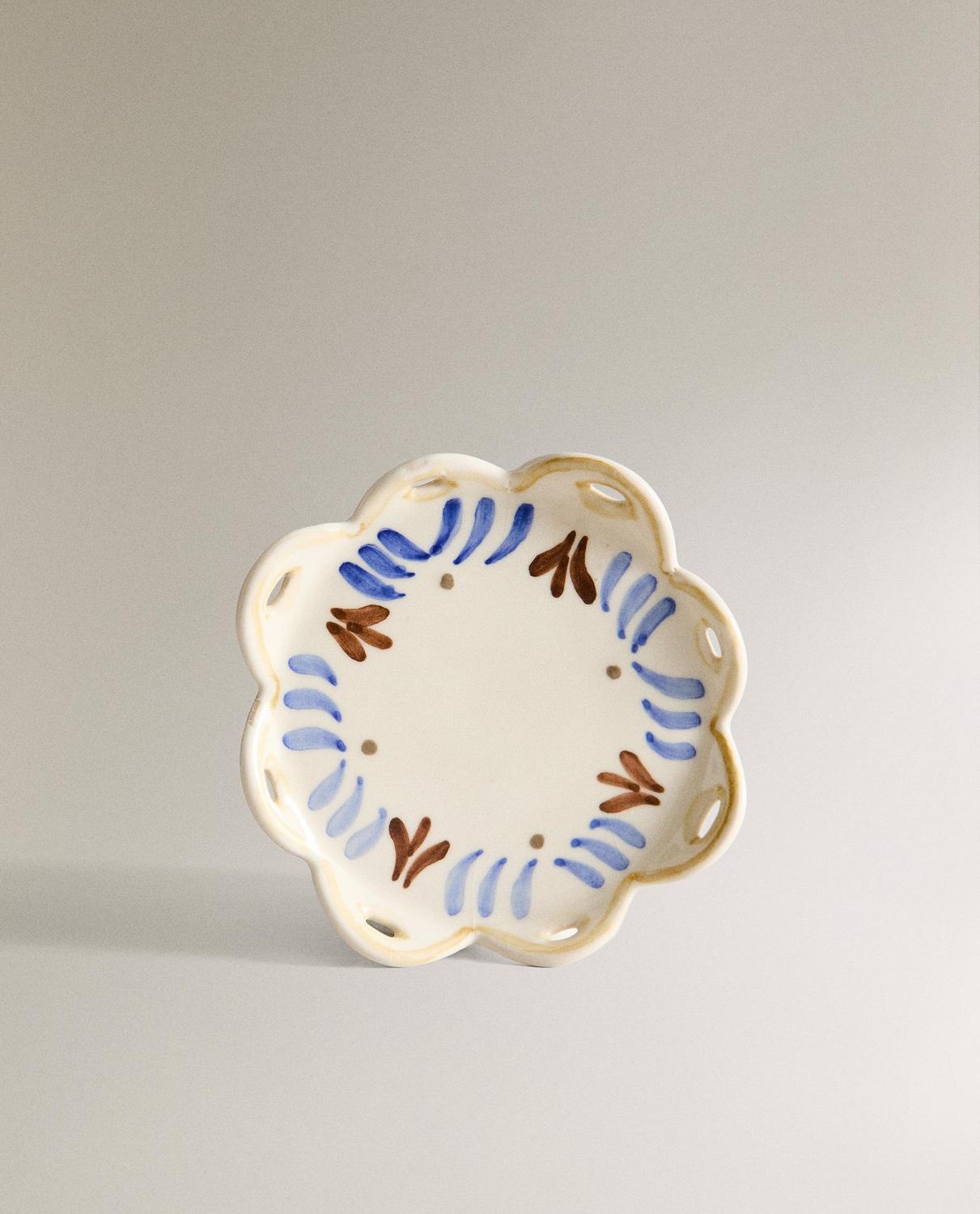 Керамическая боковая тарелка в форме цветка с расписными деталями.