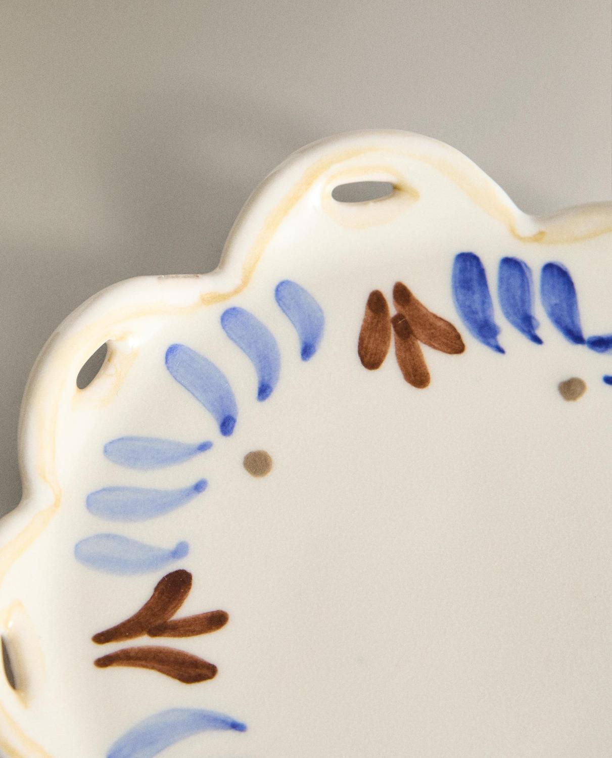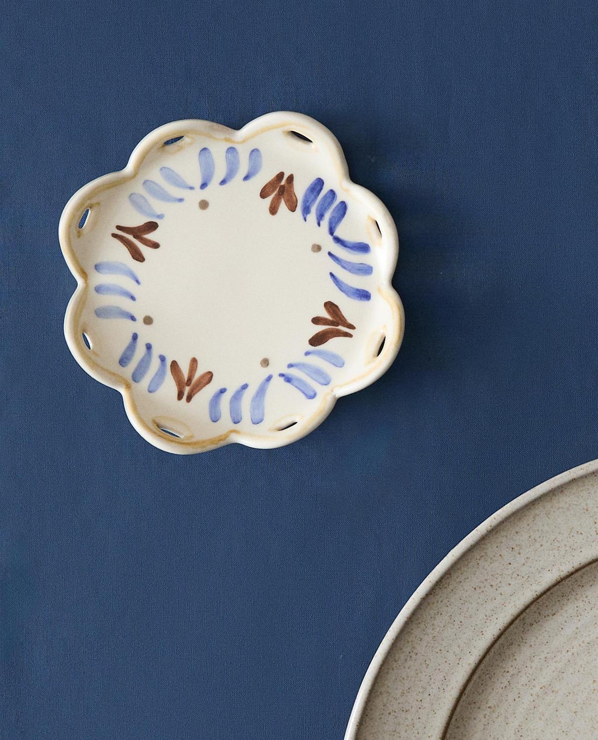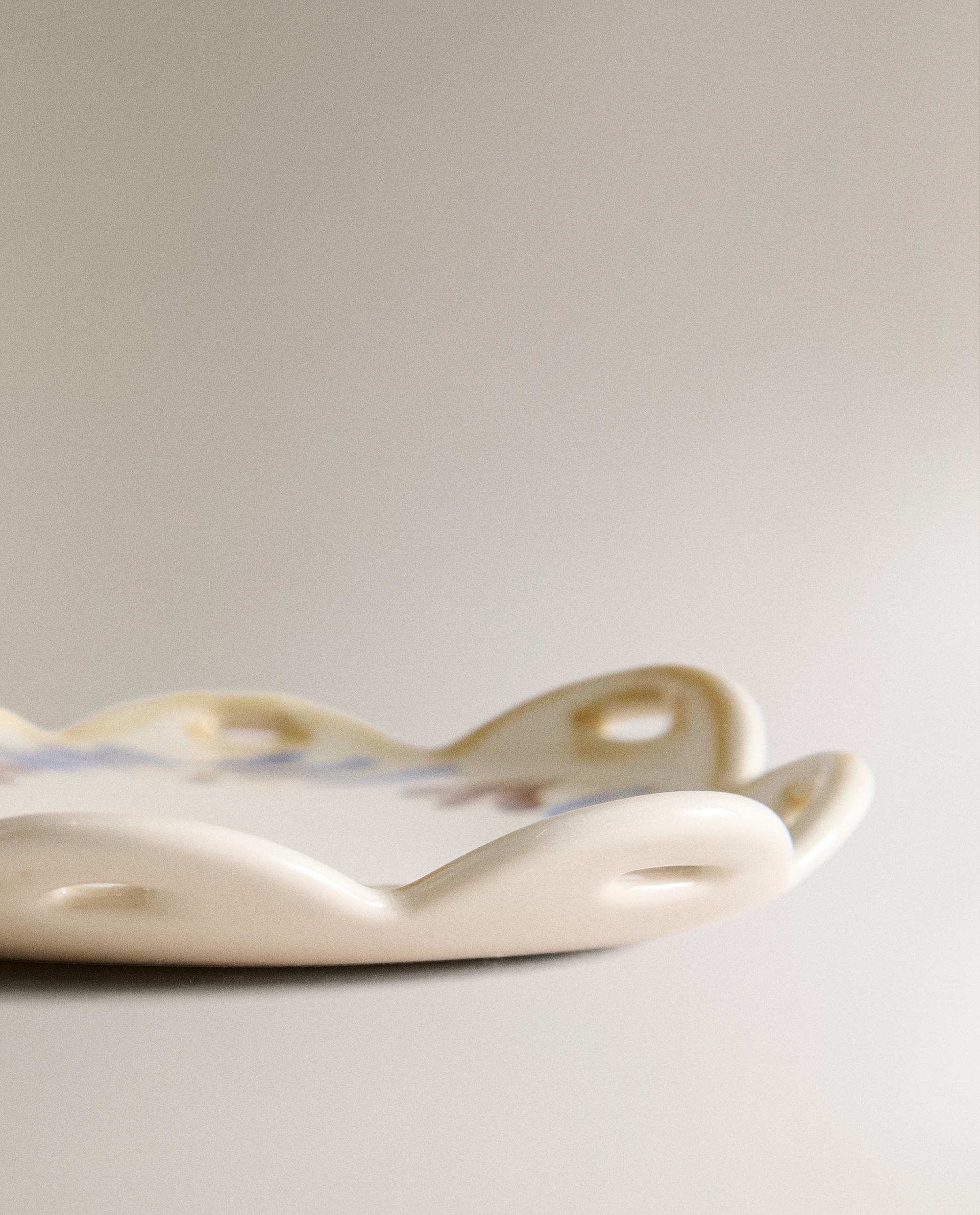 Керамическая боковая тарелка в форме цветка с расписными деталями.