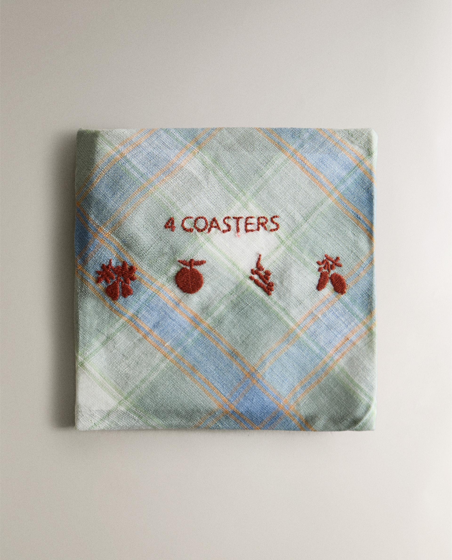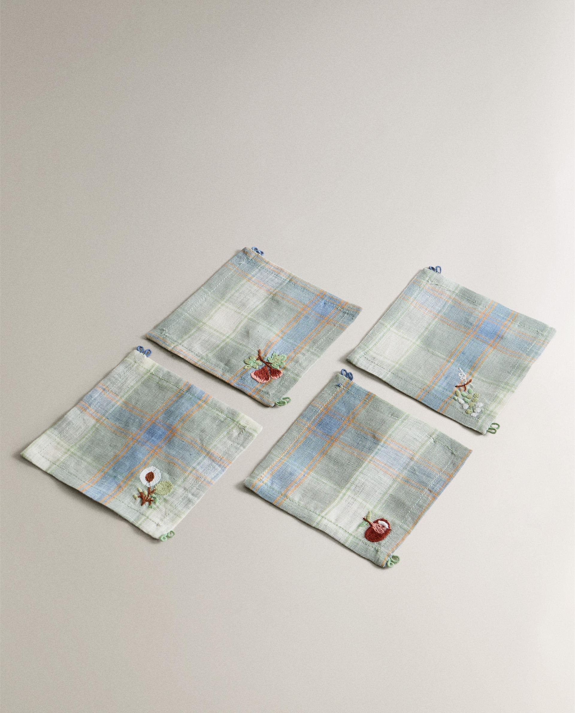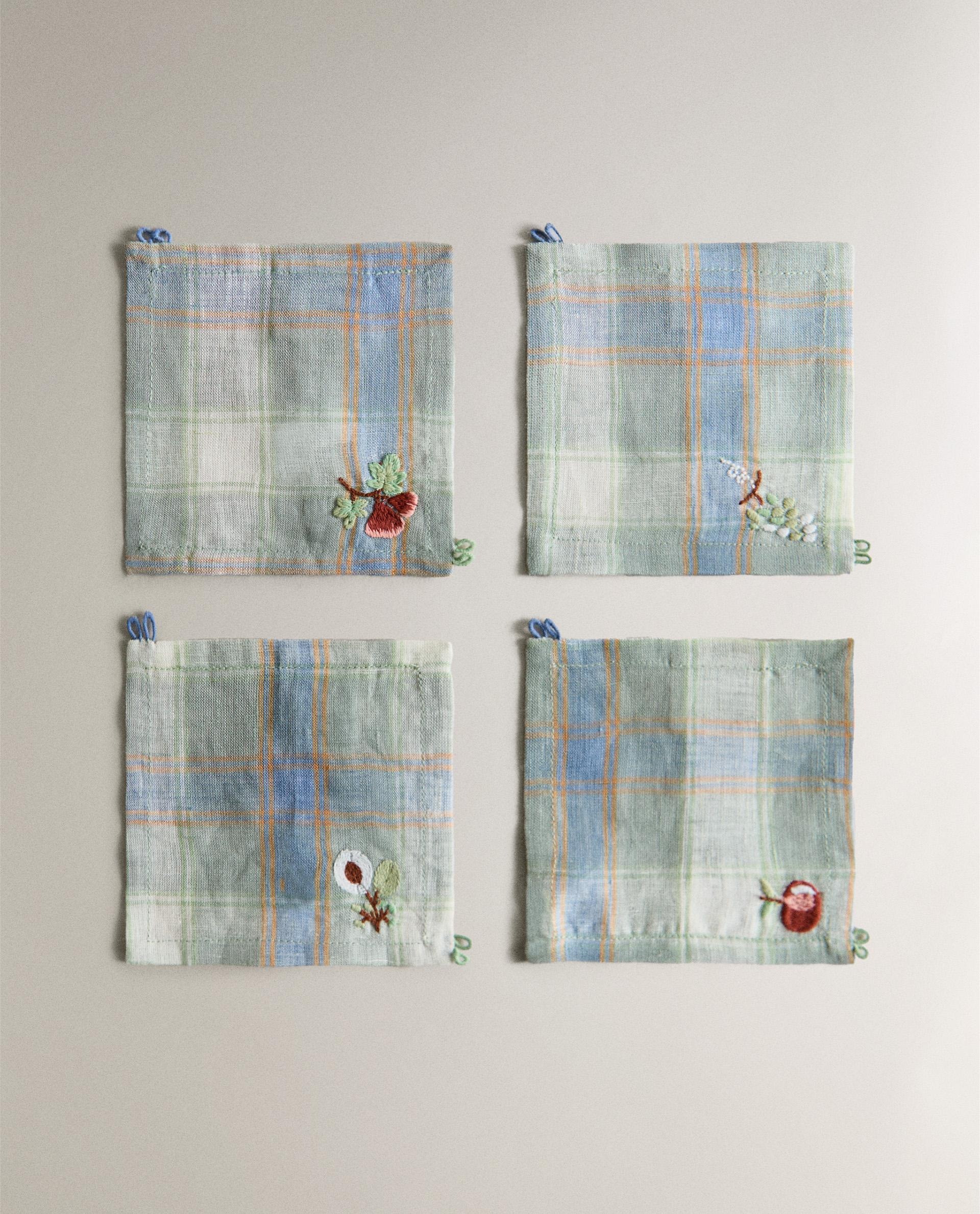 Льняные подставки с клетчатым рисунком и вышитыми цветочными деталями. В комплект входят 4 единицы и соответствующий тканевый конверт для удобства хранения.