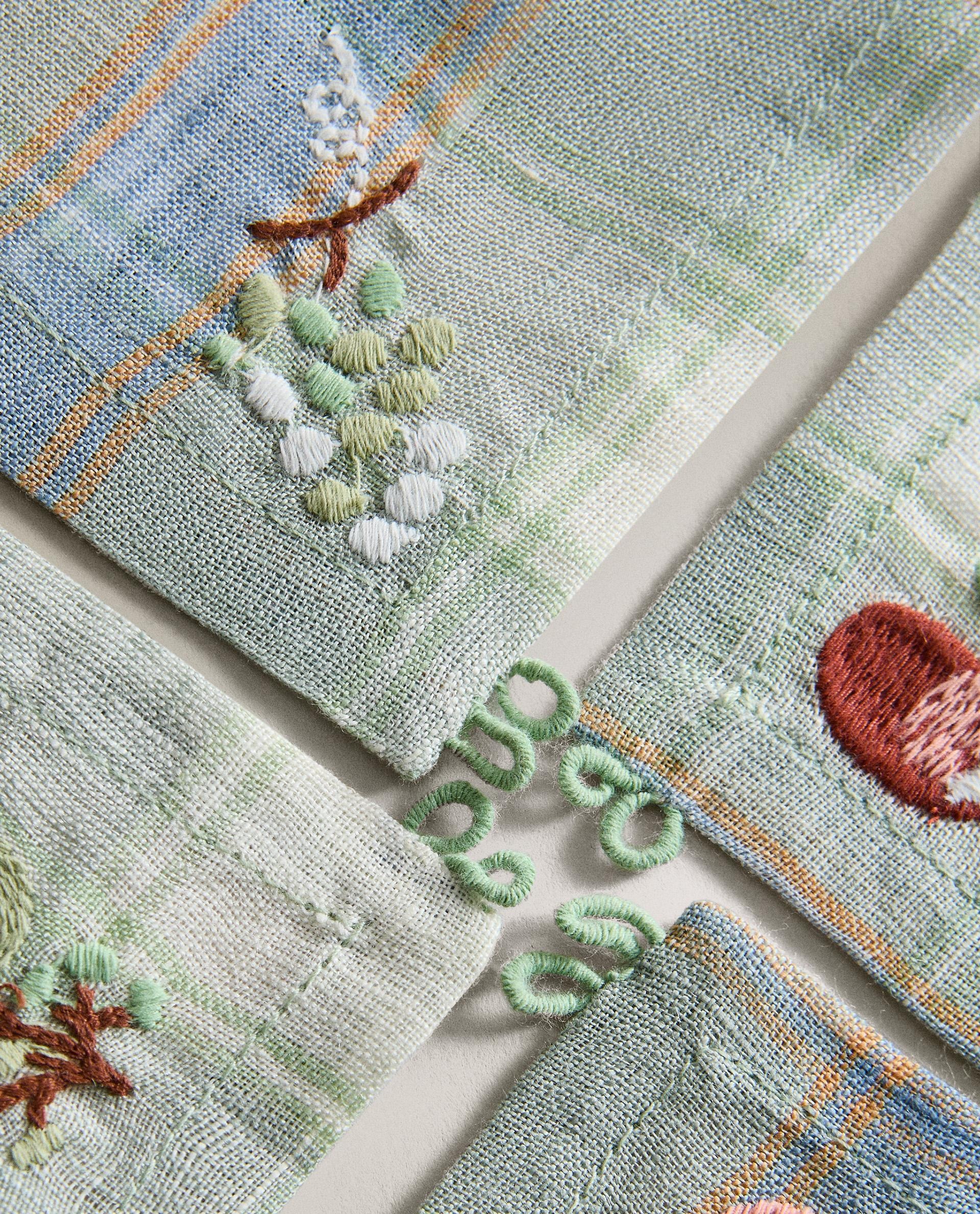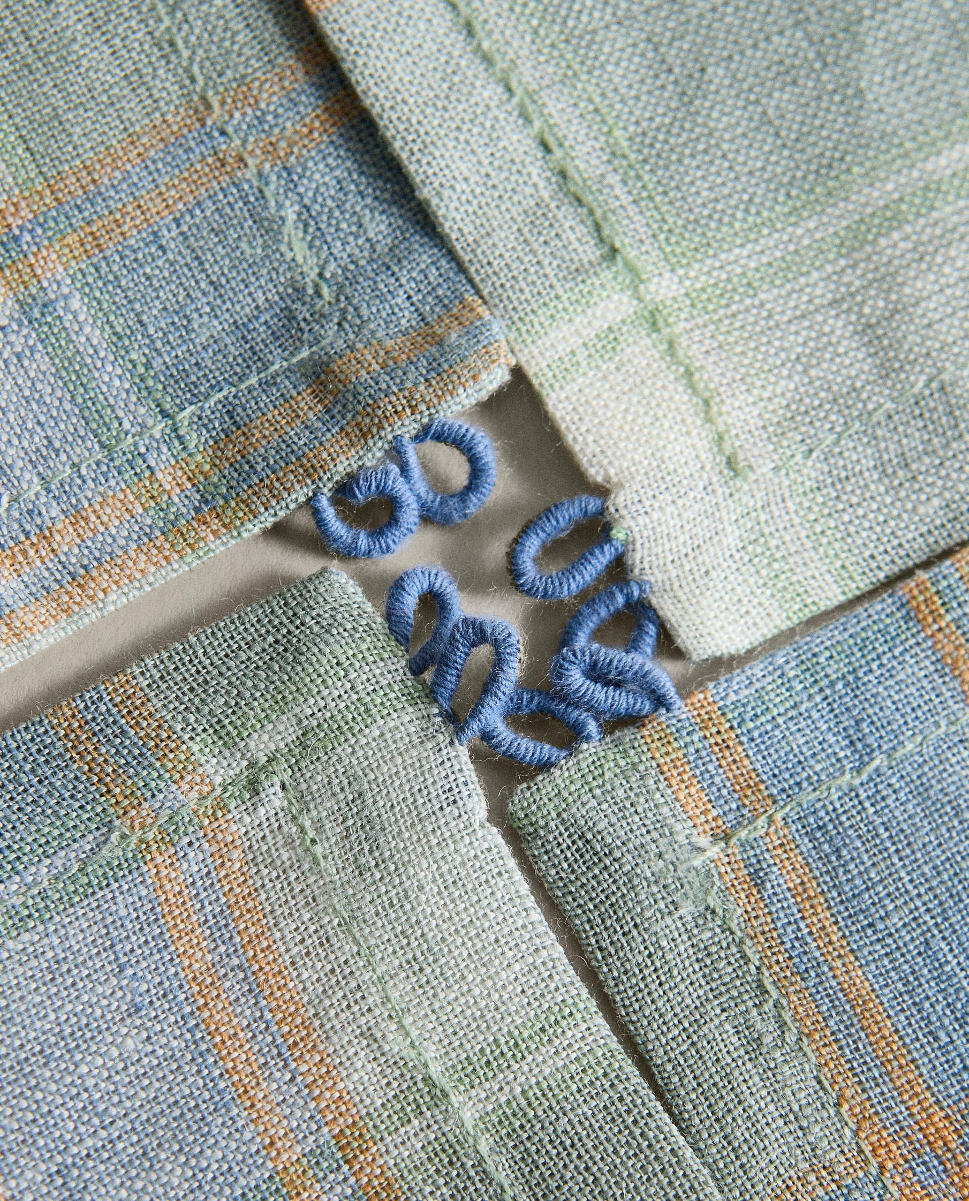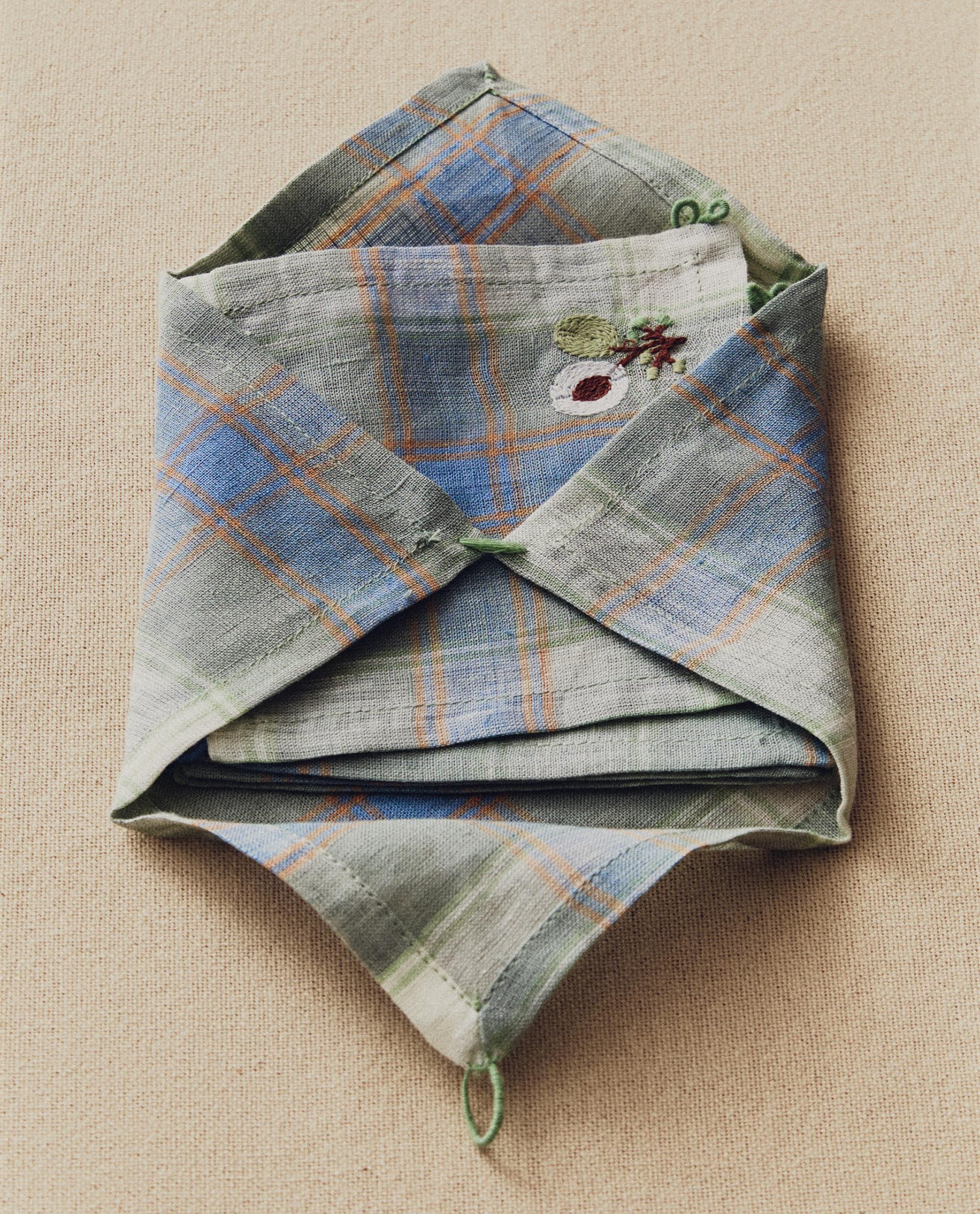 Льняные подставки с клетчатым рисунком и вышитыми цветочными деталями. В комплект входят 4 единицы и соответствующий тканевый конверт для удобства хранения.