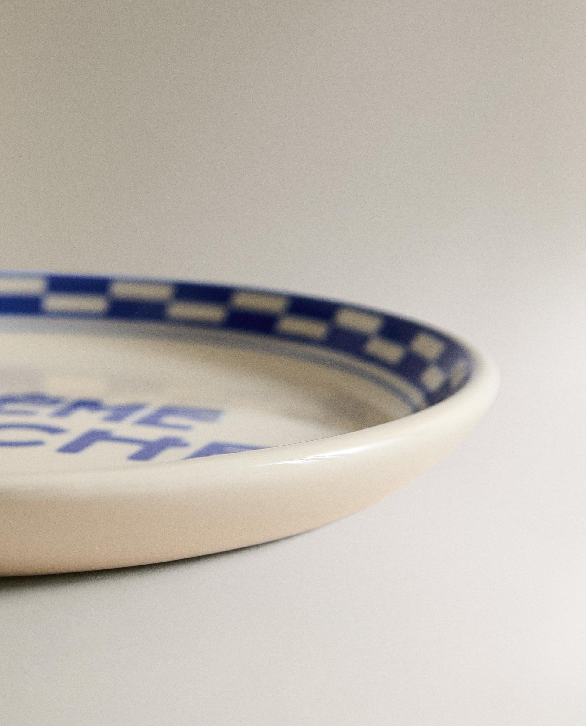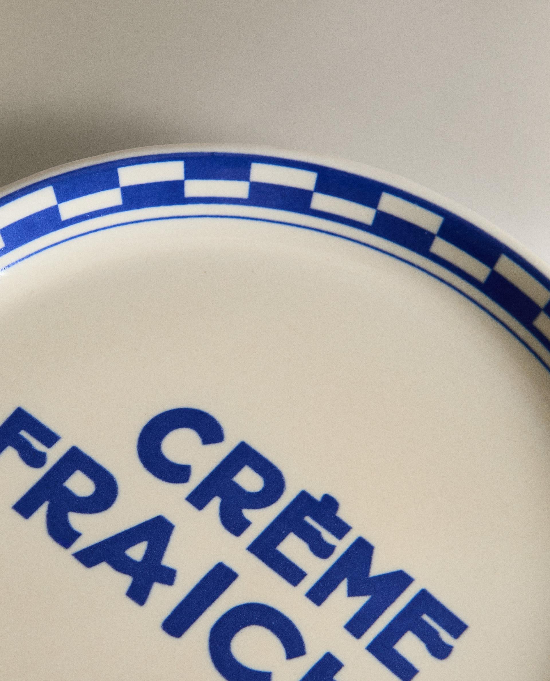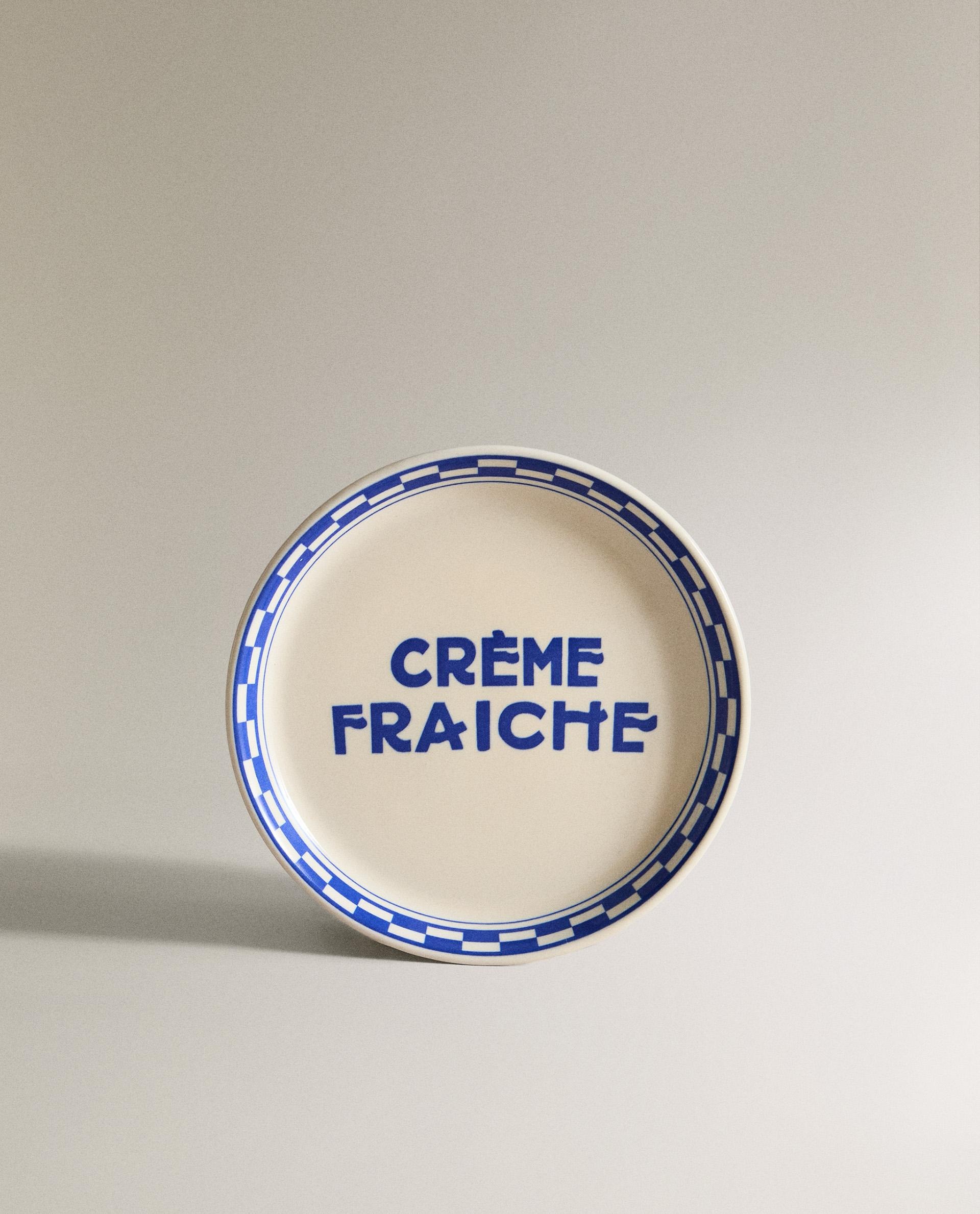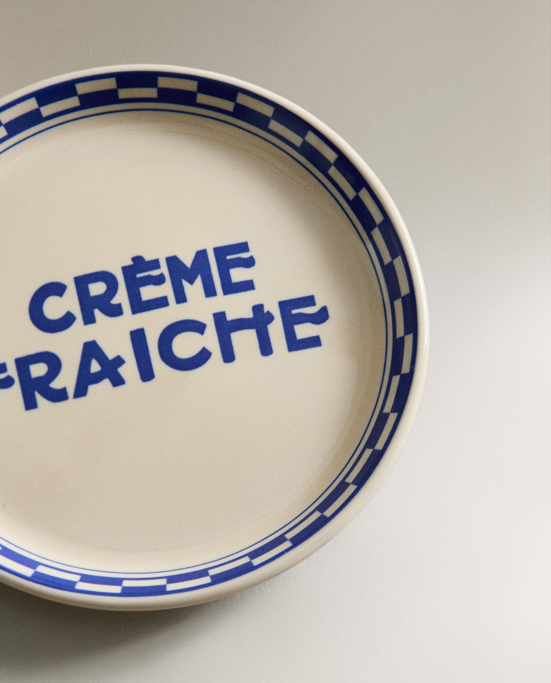 Керамическая боковая пластина с клетчатым узором по краю и надписью «CRÈME FRAICHE» в центре.