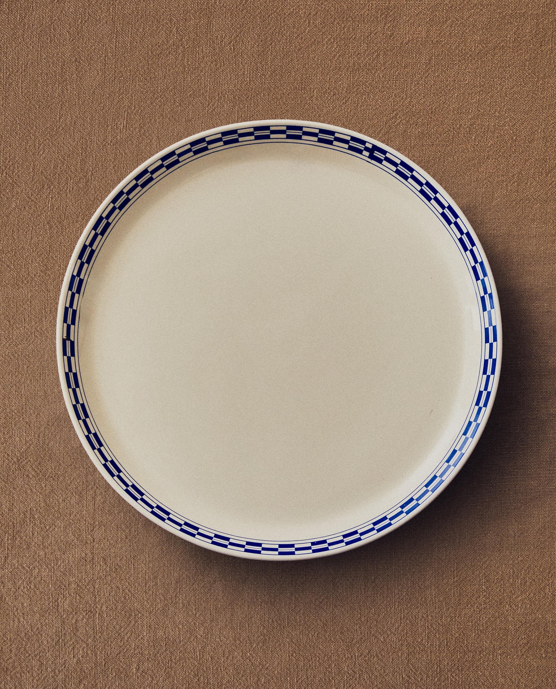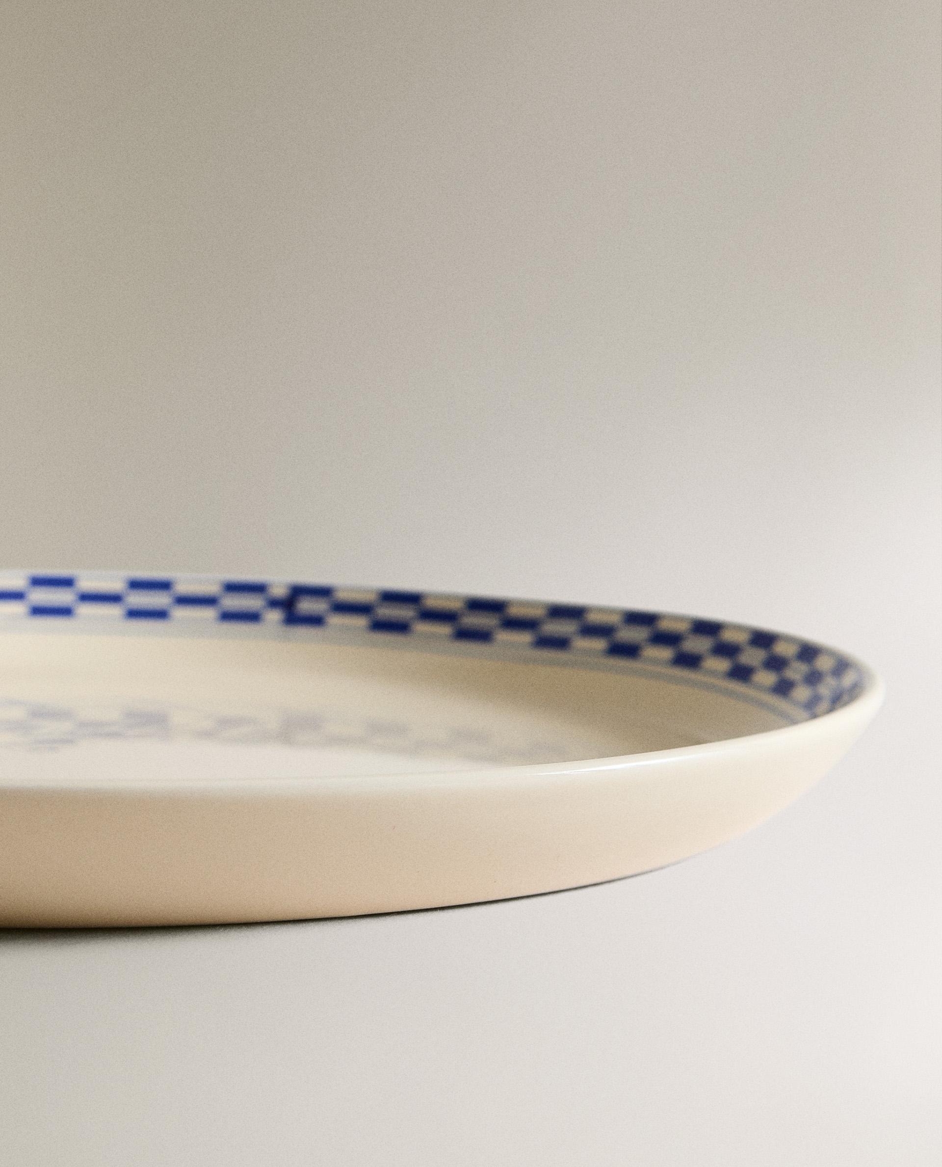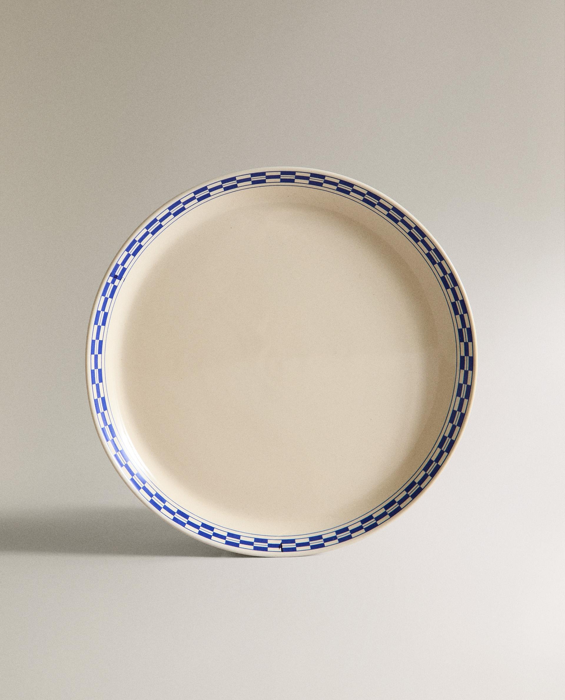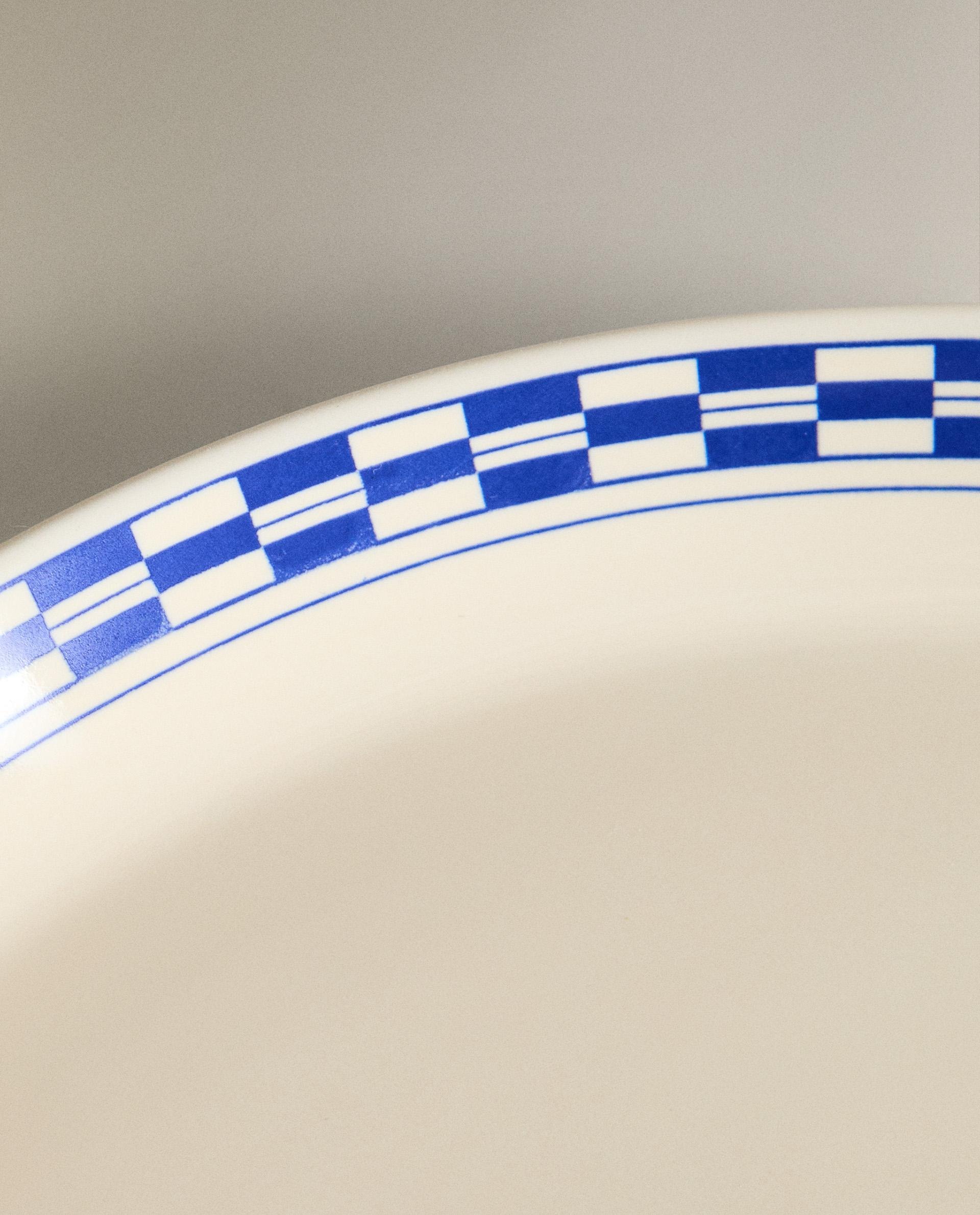 Керамическая обеденная тарелка с клетчатым узором по краю.