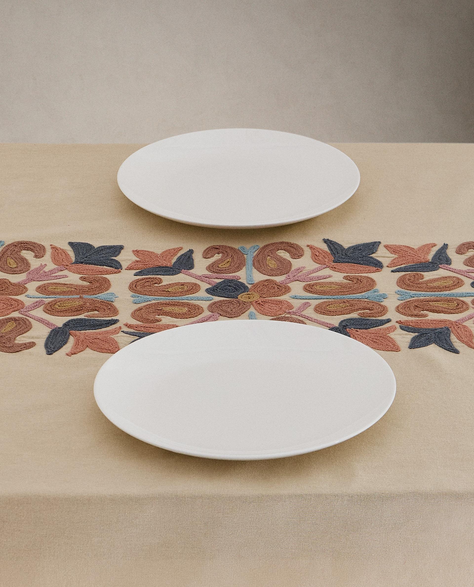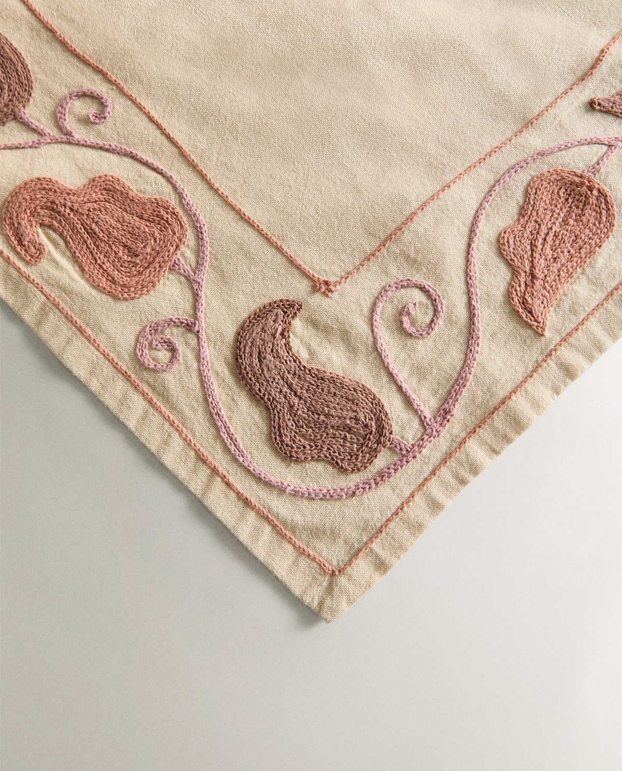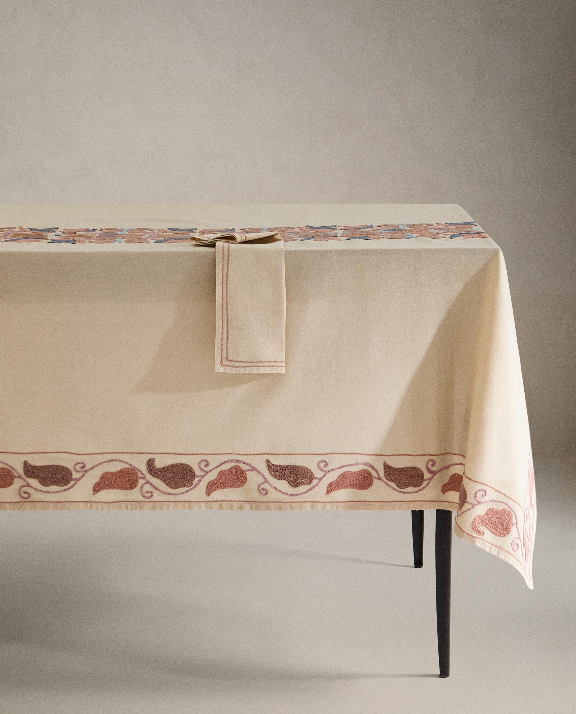 Хлопковая скатерть с цветочными аппликациями и разноцветной вышитой каймой.