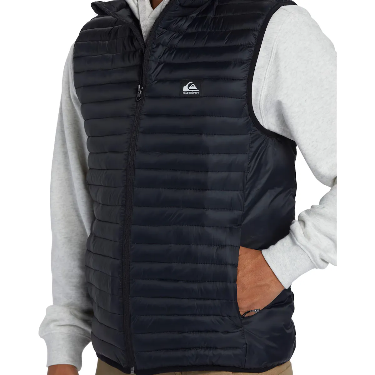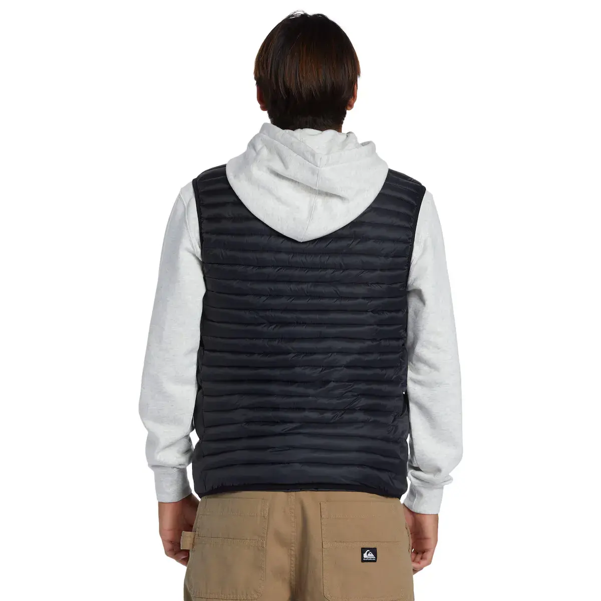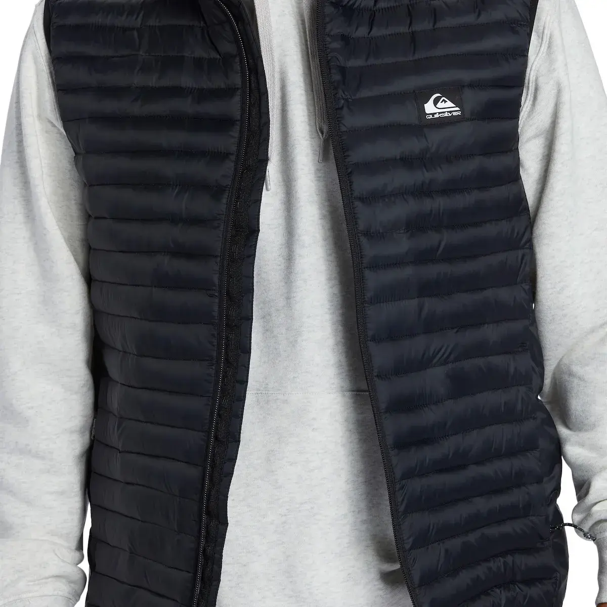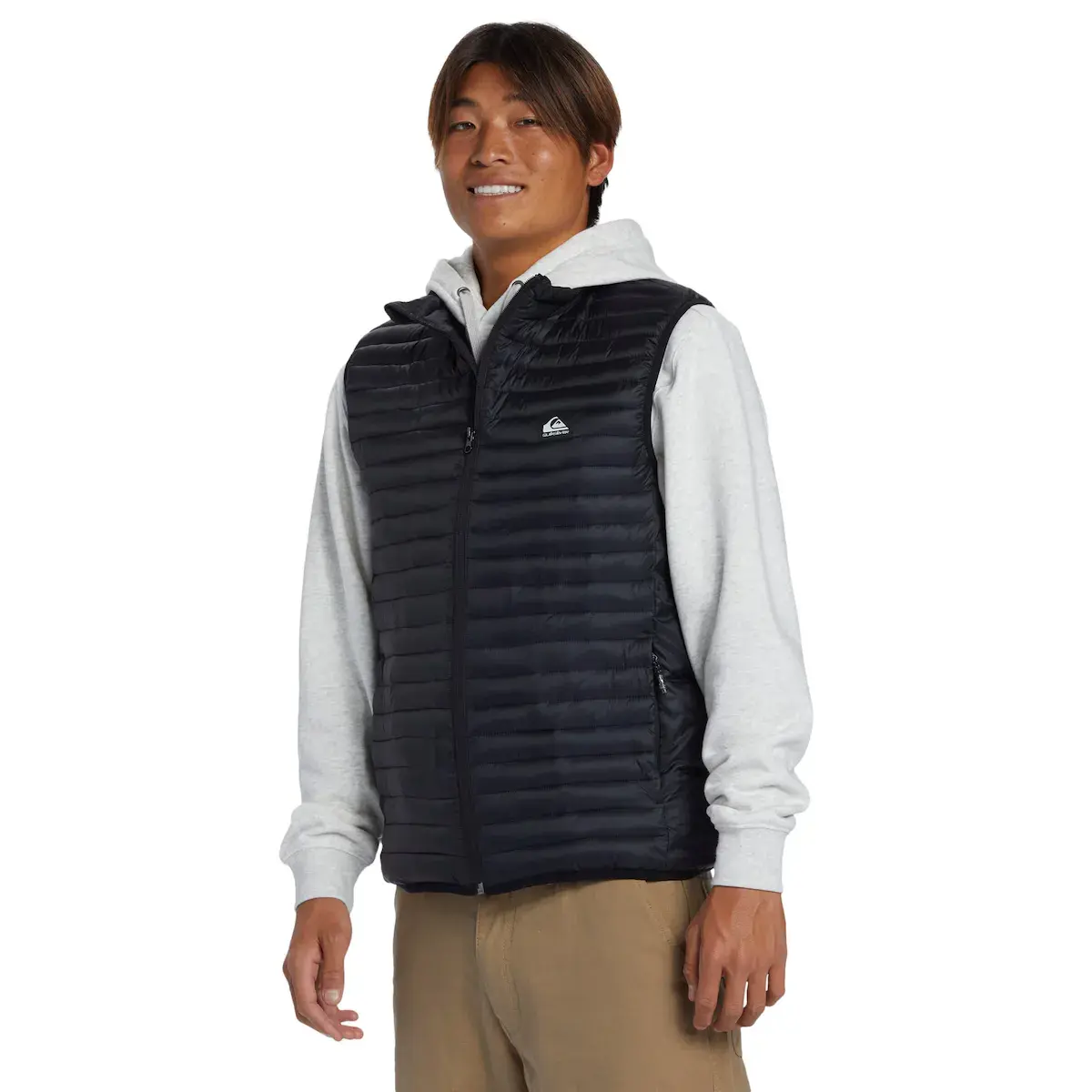 Куртка с утеплителем для мужчин. Характеристики: Коллекция: Lifestyle, предназначена для повседневных приключений, Преимущества: технология Quiksilver DryFlight защищает от ветра и влаги., Индекс WarmFlight 2/3 очень теплый утеплитель с малым объемом, Вес наполнителя: полифил 220 г, Сделано лучше: прочная водоотталкивающая пропитка без PFC для большей водонепроницаемости, Изделие изготовлено на 91% из переработанного нейлона и переработанных полиэстеровых волокон, полученных из пластиковых бутылок., Ткань: 100% переработанный нейлон [37 г/м2], крой: обычный крой, Воротник: высокий воротник, Рукава: без рукавов, Застежка: фронтальная застежка на молнии, Карманы: два кармана на молнии для рук, Подкладка: переработанный нейлон [37 г/м2] и Другие характеристики: подол и манжеты с эластичными краями.