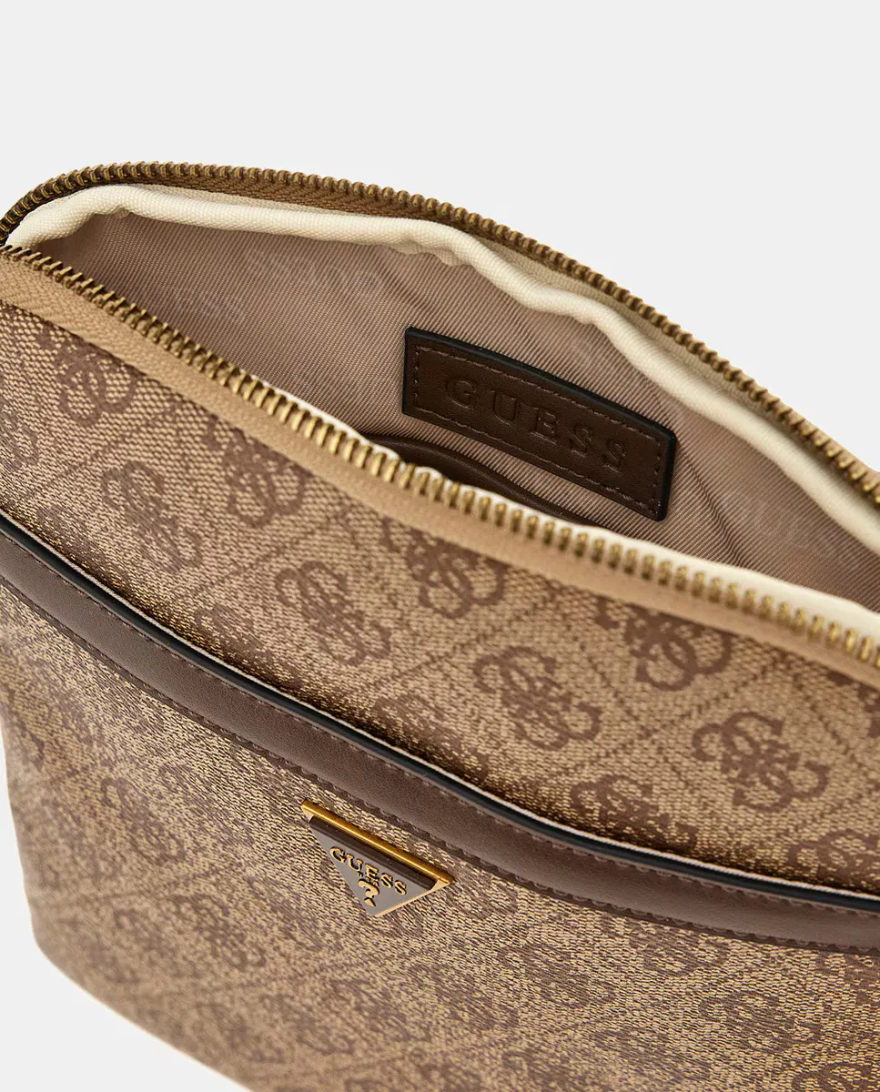 Плоская сумка бежевых тонов с логотипом пион. Имеет внешний карман на молнии. Регулируемая ручка с золотым логотипом.