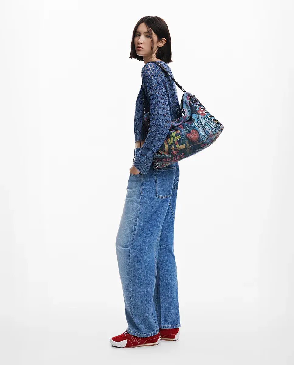 Большая сумка через плечо из ткани в стиле деним с граффити-принтом, сменными ручками и плетеными деталями по бокам.