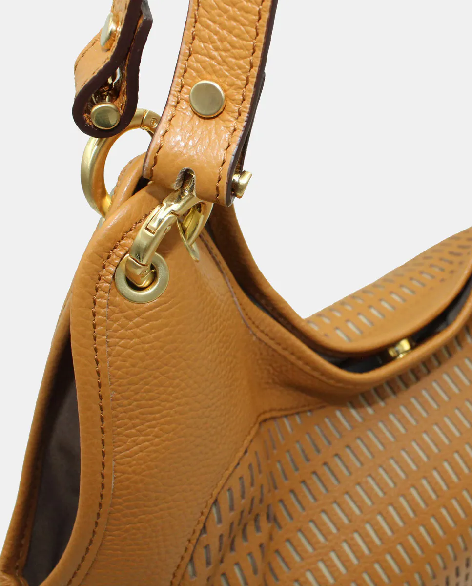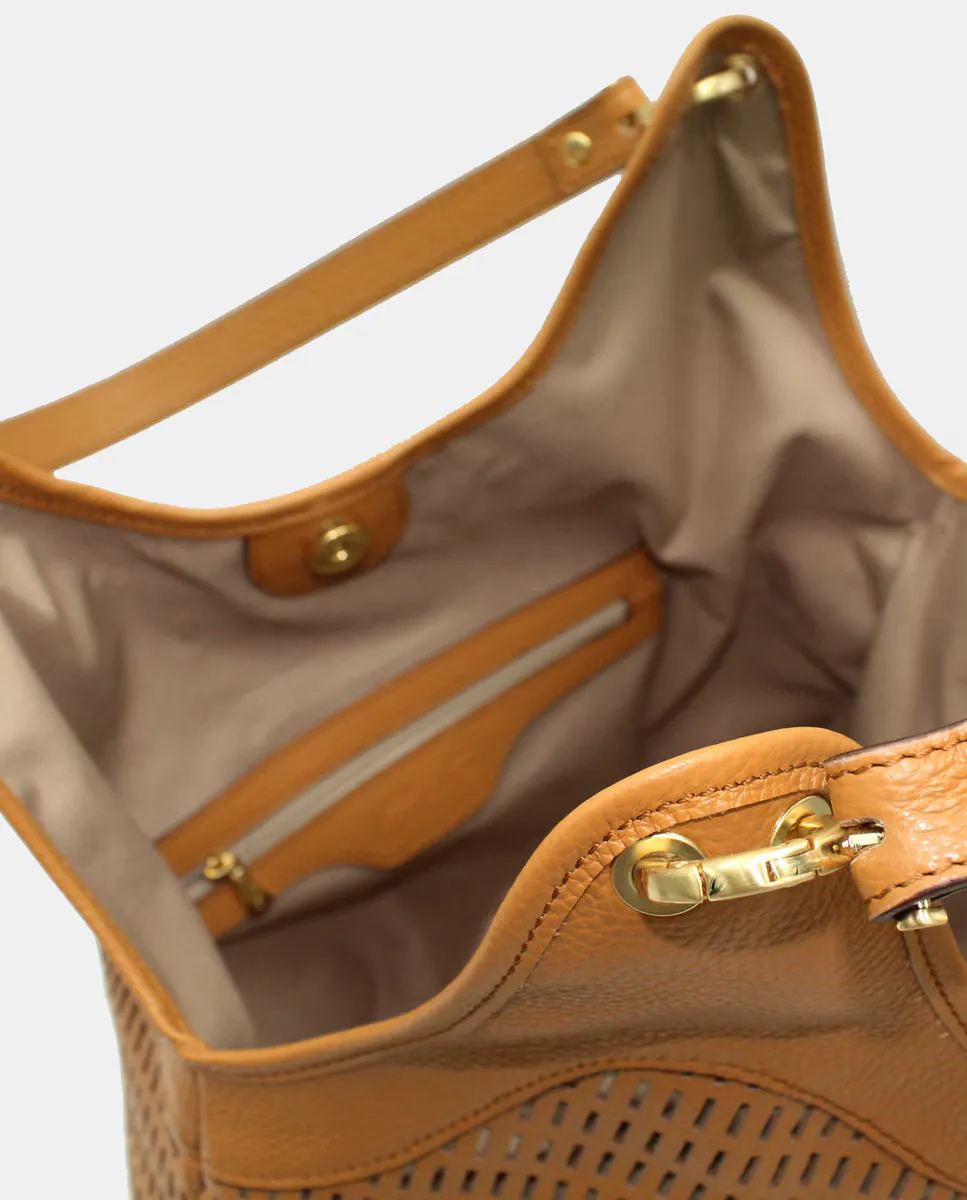 Тотальный сумка из кожаной текстуры цвета верблюда, комбинированная с перфорацией в тон. Она имеет две ручки для ношения на плече и магнитную застежку. Внутренняя часть сумки подкладена и имеет два кармана. Металлический логотип спереди и золотистая фурнитура.