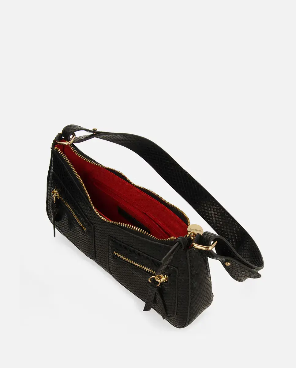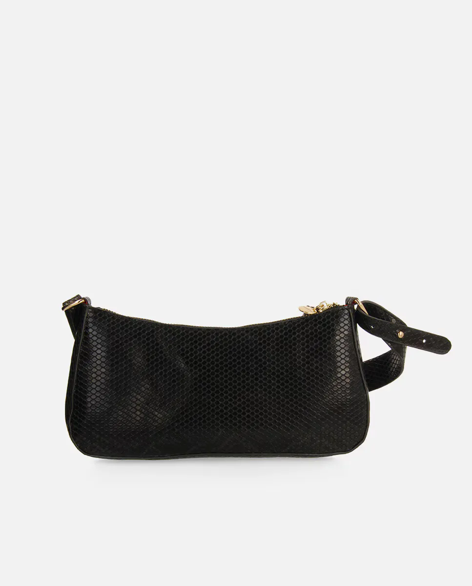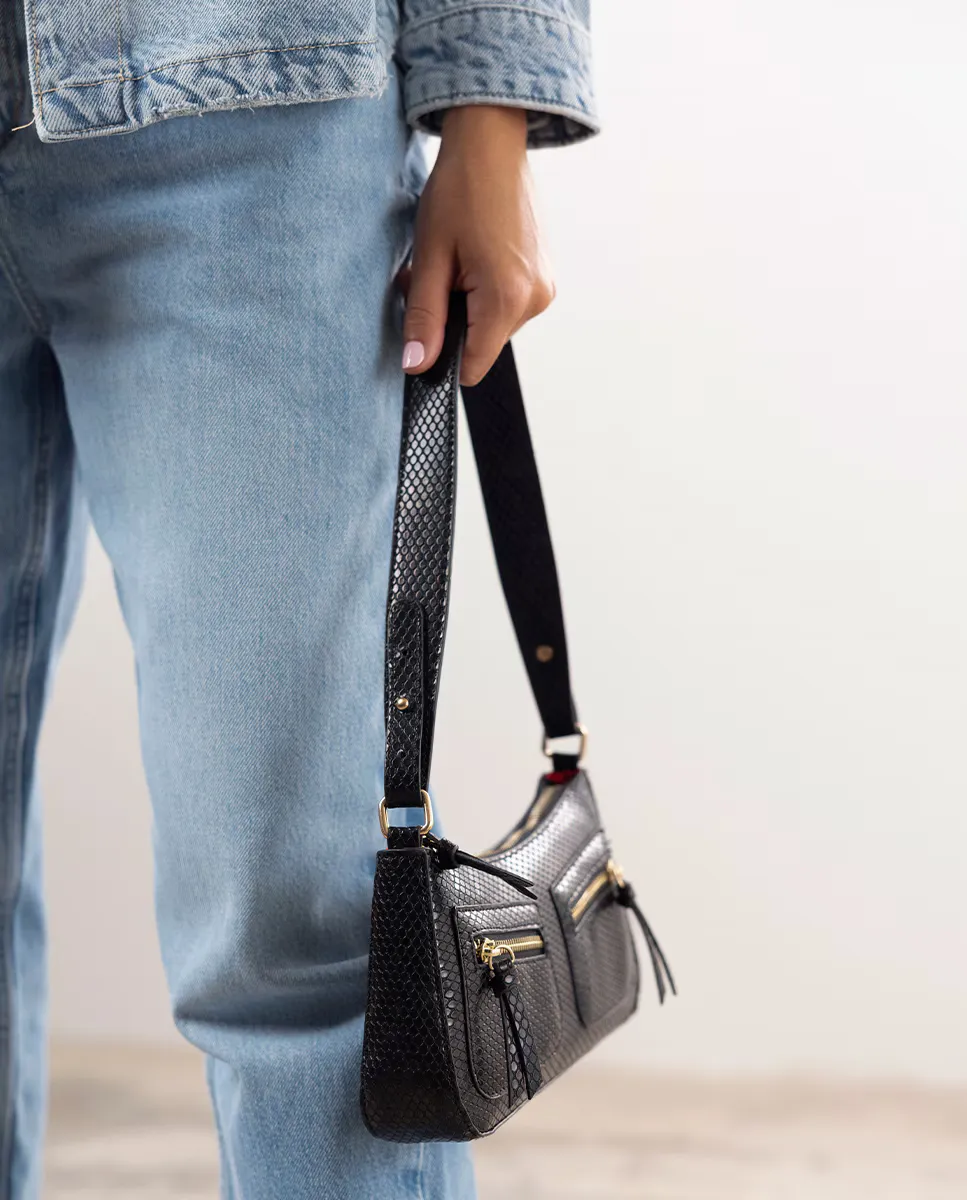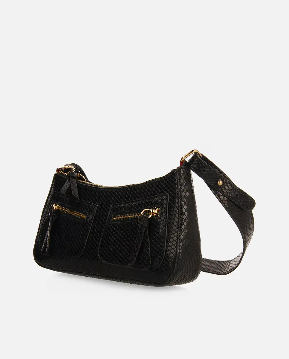 Базовая сумка, которая будет с вами на протяжении всего сезона. Черная сумка через плечо типа «багет» с текстурой под змею и карманами. Застежка на молнии. Регулируемые ручки. Откройте для себя все новинки женских сумок в новой коллекции аксессуаров Gioseppo.