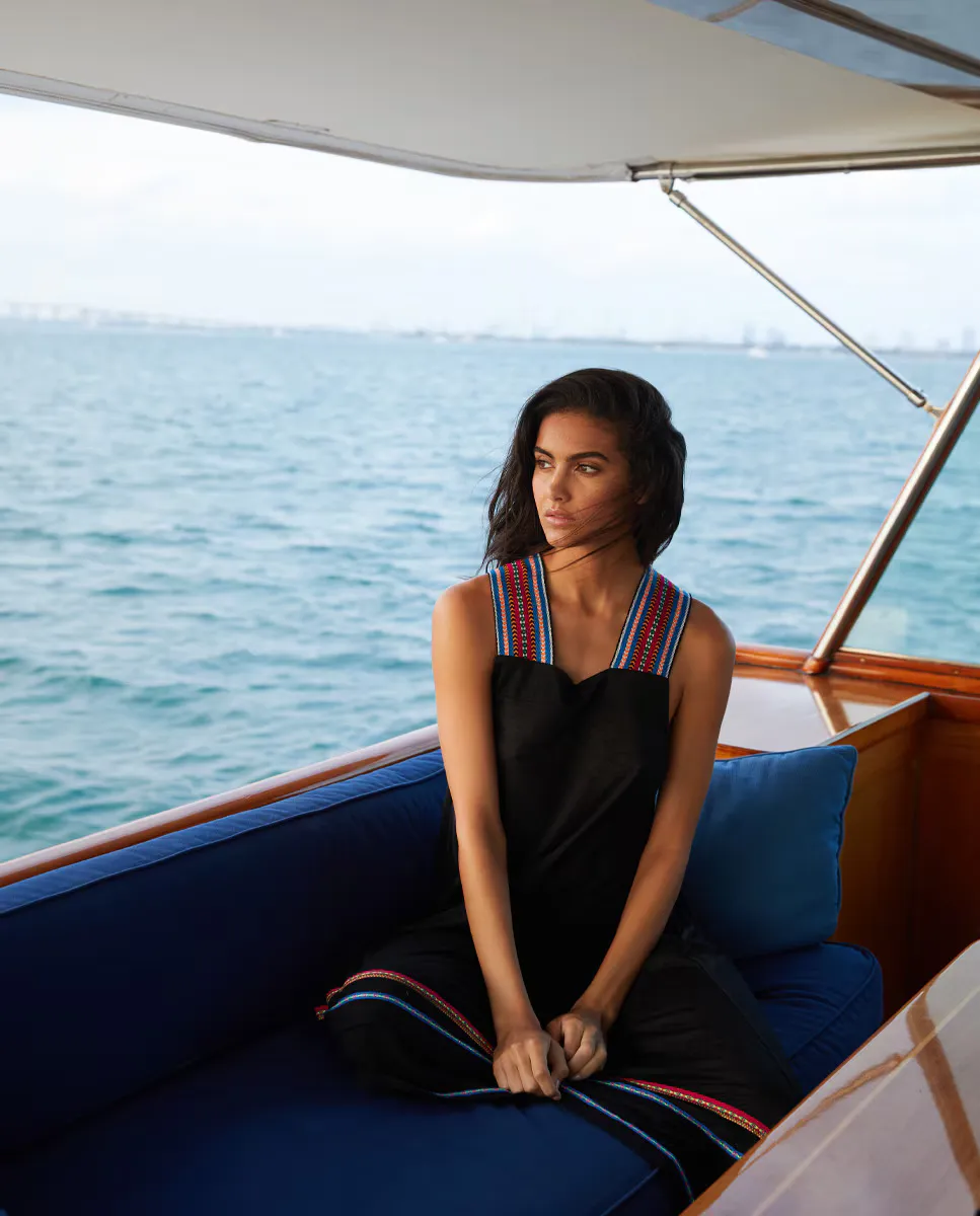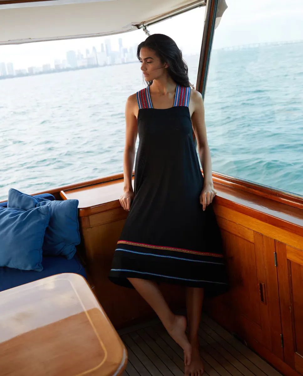 Черное пончо с вышивкой по краям. Идеально, чтобы укрыться, и его легко можно надеть после пляжа прямо на улицу.