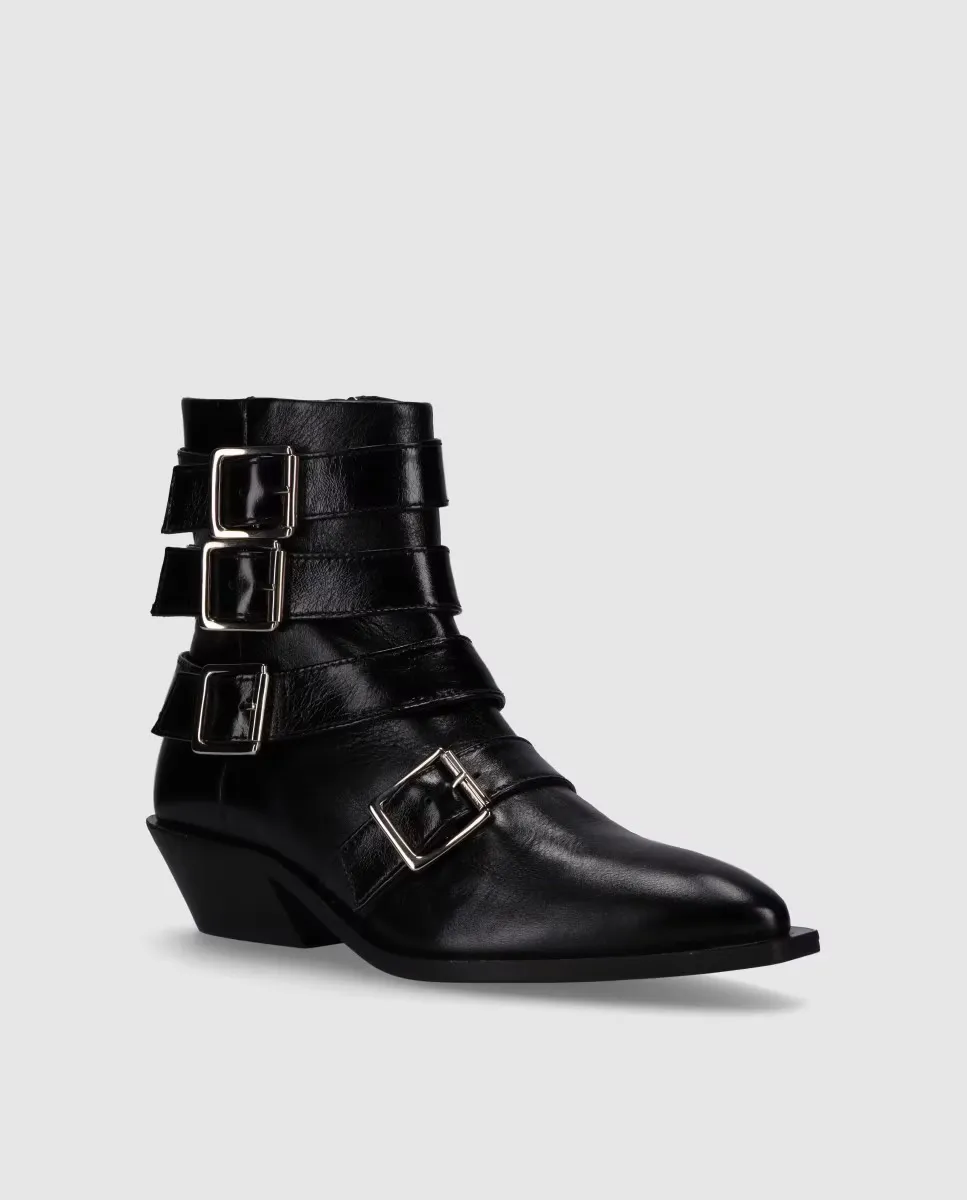 Не уверены, чувствуете ли вы себя больше ковбойкой или амазонкой? Вот идеальный компромисс. Сшитые из кожи, ботинки Eras – это укороченная версия Ryder, с заостренным носком, каблуком в ковбойском стиле и типичными для верховой езды серебряными пряжками.
