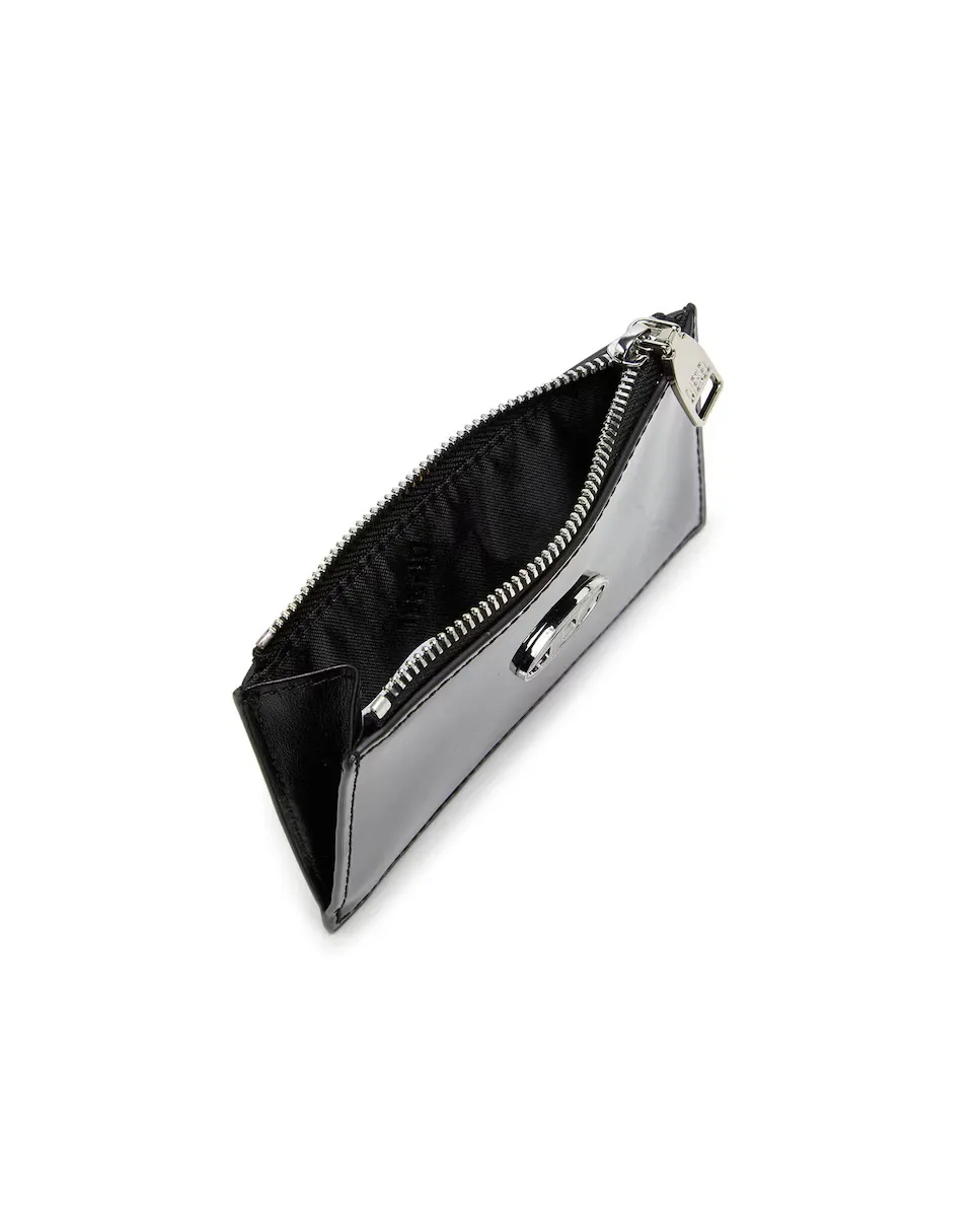 Этот элегантный женский кошелек для карт выполнен из очень блестящей и сияющей кожи и имеет металлическую деталь с эмалью в форме овал D. Ультратонкий дизайн включает несколько слотов и верхний карман на молнии для хранения монет или сложенных банкнот.