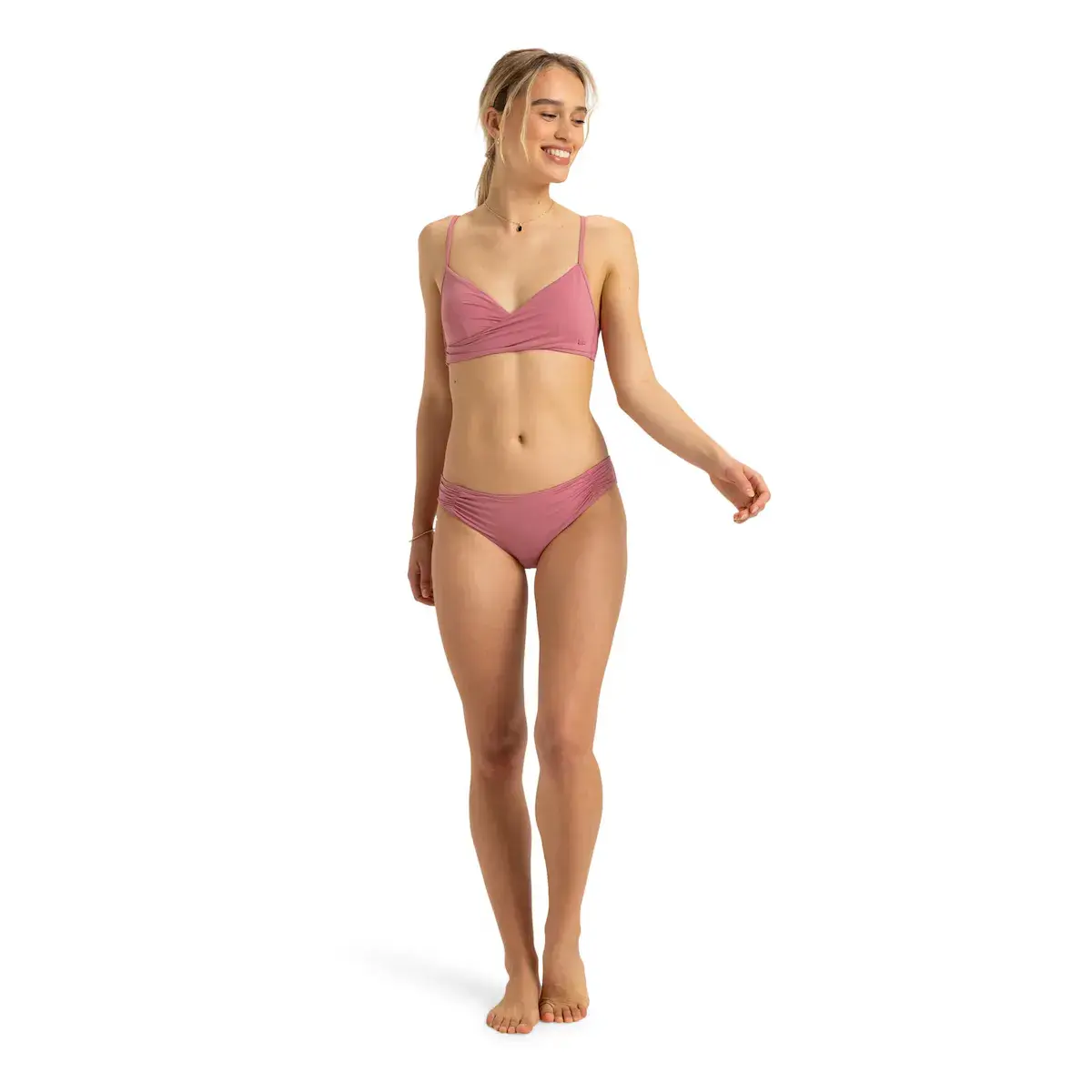 Топ бикини средней степени покрытия для женщин. Характеристики включают: Коллекция: SD Beach Classics, Ткань: Эластичная, мягкая и прочная ткань, смесь 85% переработанного полиэстера и 15% эластана, Дизайн: оберточный бралетт, Вырез: V-образный вырез, Поддержка: нормальная поддержка, Уплотнение: съемные подкладки, Ремешки: регулируемые и переставляемые с кольцами и скользящими лямками, Застежка: крючок с 3 отверстиями, позволяющий выбирать различные длины сзади, Размер чашки: лучше всего подходит для размера чашки A/B/C, Покрытие: среднее покрытие, Бренд: резиновая эмблема ROXY, Другие характеристики: Ремешки можно носить прямо, крест-накрест или завязывать на шее в зависимости от стиля.