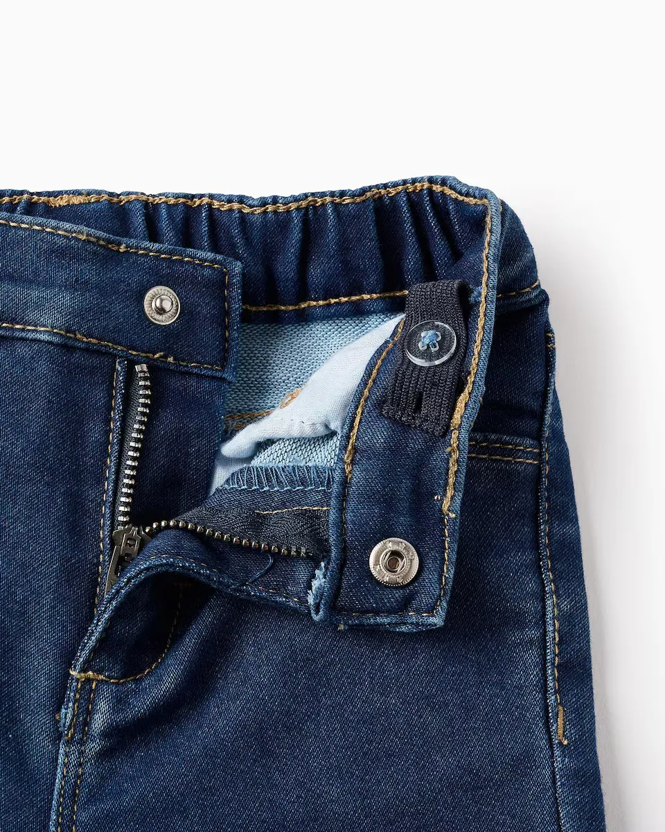 Джинсы с расклешенными штанинами для девочки, из хлопка с небольшой эластичностью для большего комфорта и свободы движения. Закрываются на кнопку, регулируются внутри с помощью резинок и кнопок. Контрастные швы жёлтого цвета. Удобные и модные штаны!