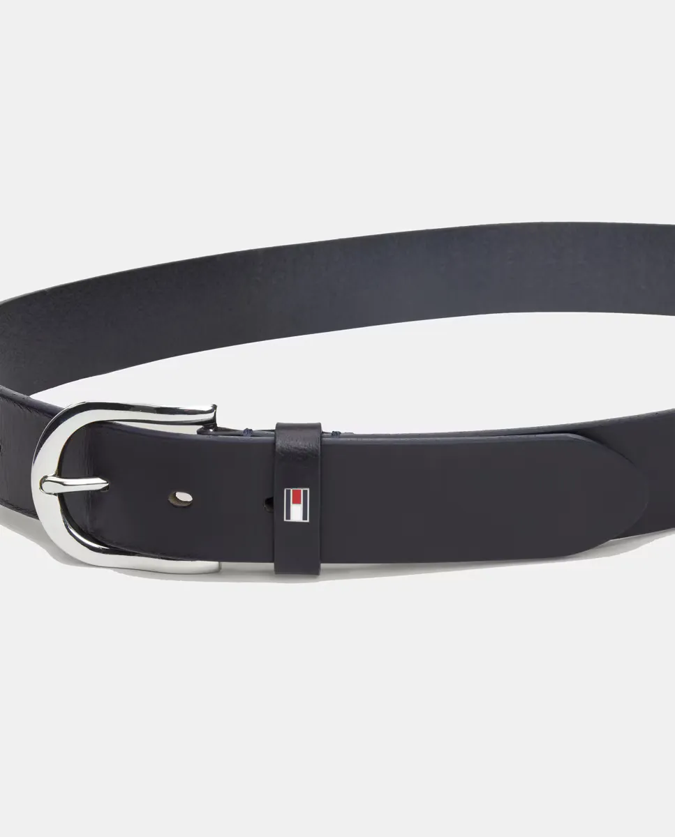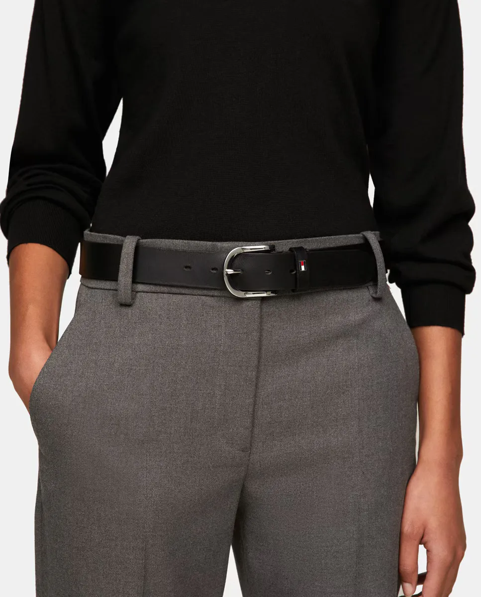 Женский кожаный ремень черного цвета. Застежка с пряжкой и металлическим логотипом Tommy Hilfiger на петле.