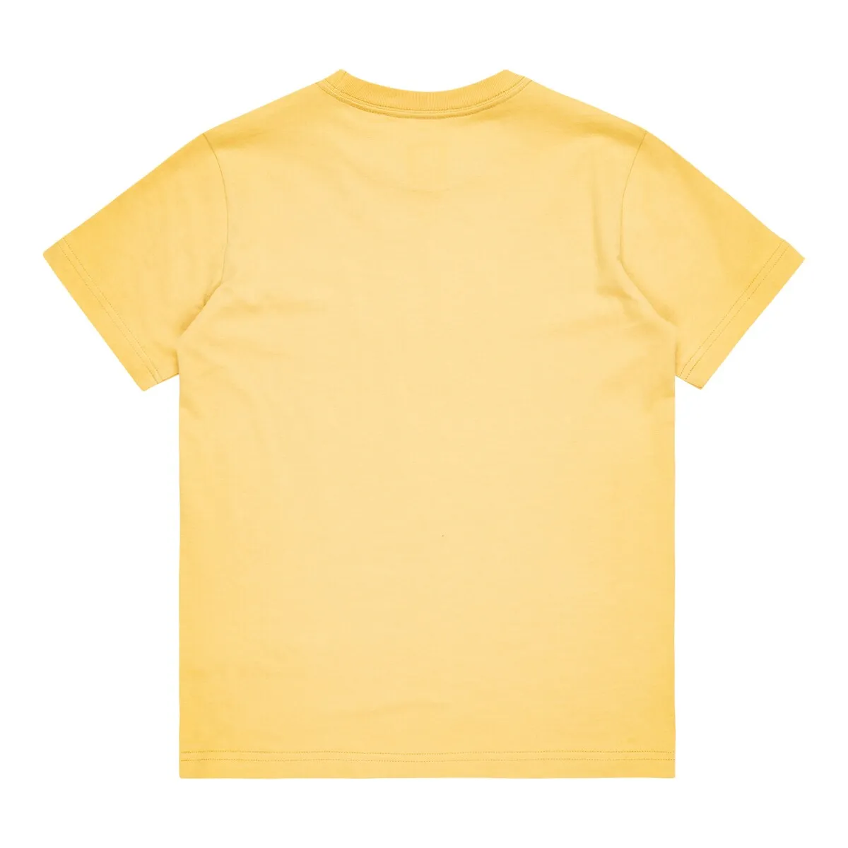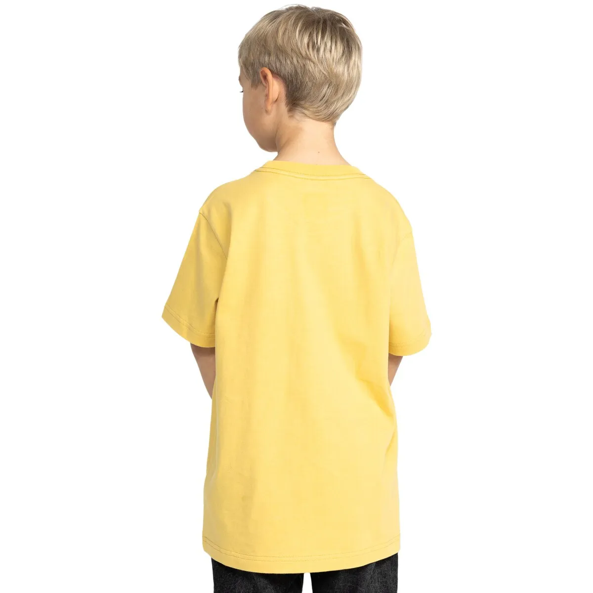 Футболка для детей. Характеристики включают: трикотаж из переработанного хлопка [200 г/м2], обычный крой, круглый вырез, бренд: принты на груди, шелкографированная этикетка на центральной задней части выреза и вертикальная клип-этикетка на подоле.