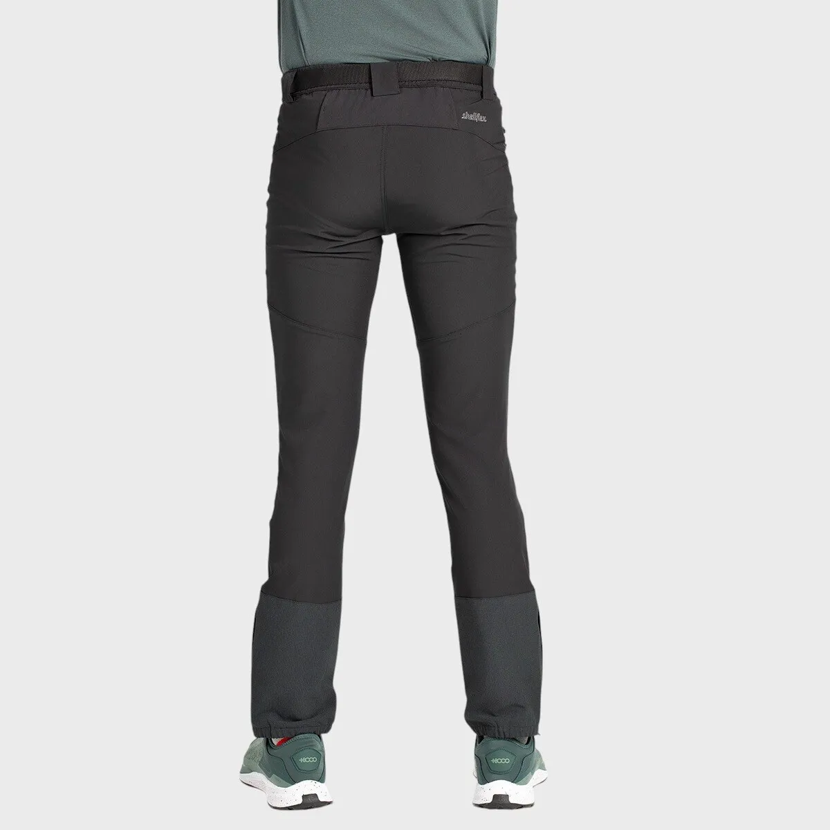 Узкие трекинговые штаны с биэластичной тканью качества Shellflex, верхние карманы и боковой карман с застежкой на молнию, предварительно сформированные колени. Эластичный пояс с индивидуальным ремнем, полус эластичные манжеты с боковыми молниями.