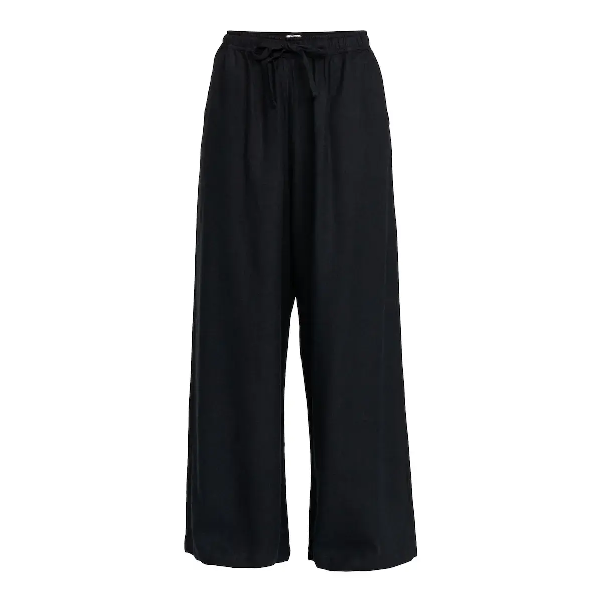Брюки с эластичным поясом для женщин. Особенности включают: ткань из смесового вискозы и льна средней плотности (198 г/м²), средняя посадка с расклешенными ногами, эластичный пояс, шнурок из ткани в тон, боковые карманы и накладной задний карман.