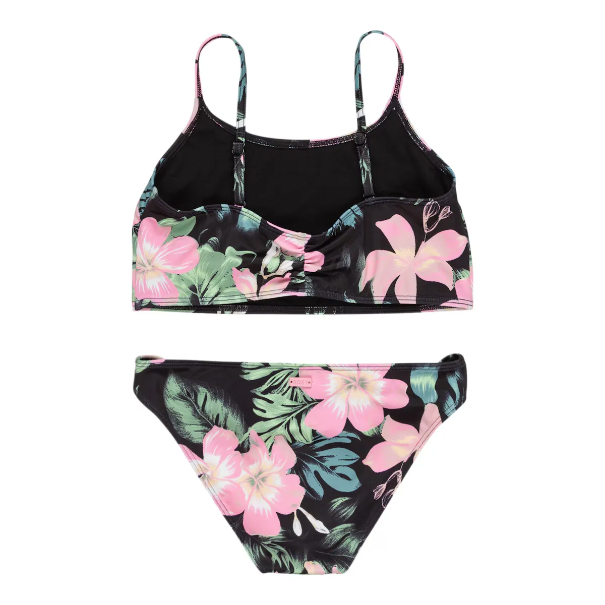 Комплект купальника из двух частей для детей (6-16 лет). Характеристики включают: Коллекция: Коллекция Shadow Floral, Ткань: мягкая, переработанная, прочная и эластичная ткань из 82% переработанного полиэстера и 18% эластана, Технология: устойчива к хлору, Вырез: Круглый вырез, Дизайн: Укороченная майка, Наполнители: съемные вставки в размерах 12-16 лет, Бретели: регулируемые бретели с кольцом и ползунком, Покрытие: полное покрытие, Застежка: фиксированная застежка, Бренд: резиновая наклейка ROXY, Другие характеристики: деталь с узлом по бокам нижней части и внешний вид продукта может варьироваться в зависимости от ситуации с нанесением рисунка.