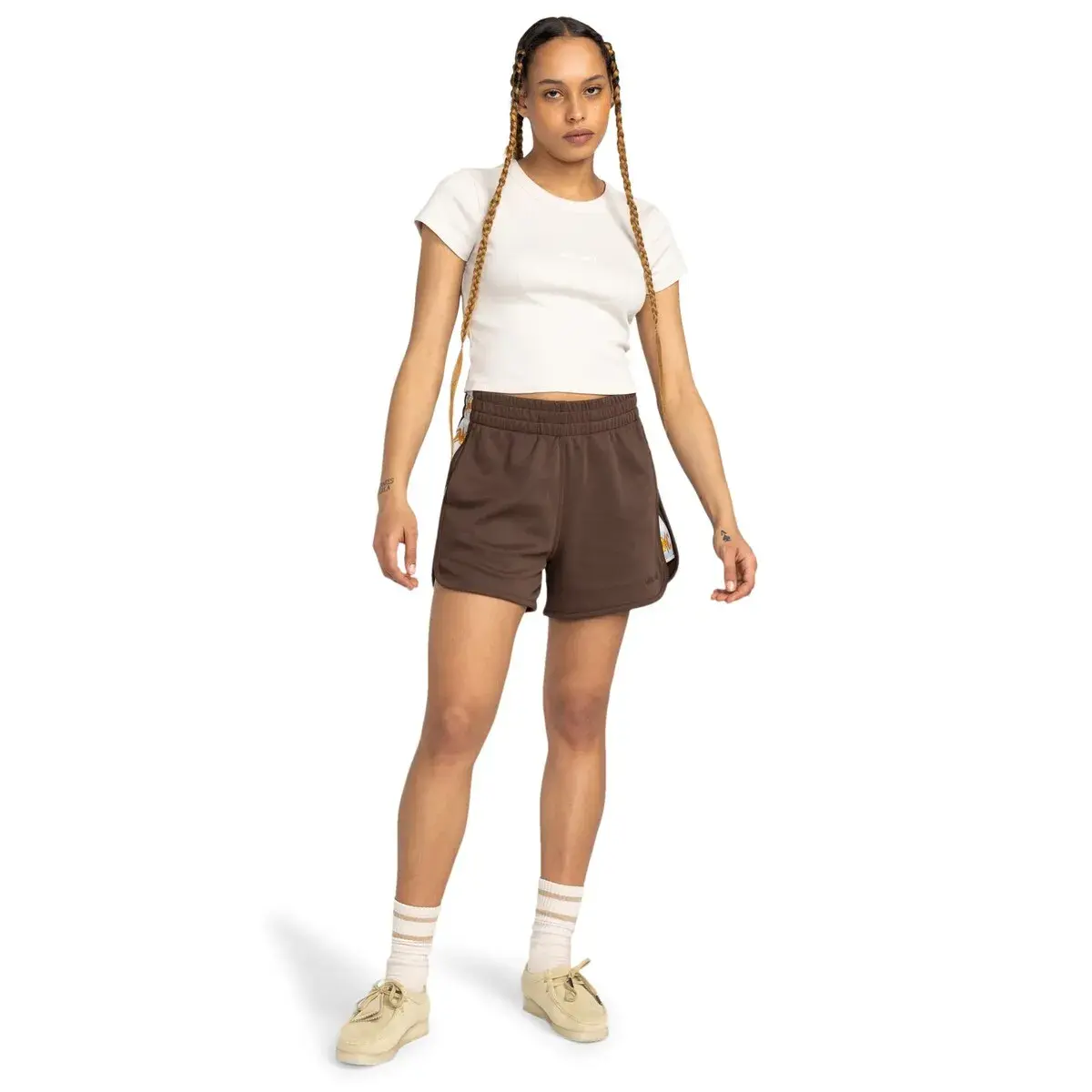 Короткие с эластичным поясом для женщин. Характеристики включают: Коллекция: основная коллекция, Ткань: интерлок, смесь переработанного полиэстера 59% и хлопка 41% (320 г/м²), С заботой о природе: переработанный полиэстер GRS, Крой: свободный, Пояс: эластичный пояс, Высота посадки: низкая посадка, Форма ноги: свободная нога, Длина шагового шва: короткая длина 35,5 см, Открытие ноги: открытие ноги 34 см, Карманы: боковые карманы, Застежка: фиксированная застежка, Марка: тональная вышивка корпоративного логотипа в верхней части ноги, Другие детали: жаккардовая лента по всей длине ноги и закругленные края с отделкой из идентичной ткани.
