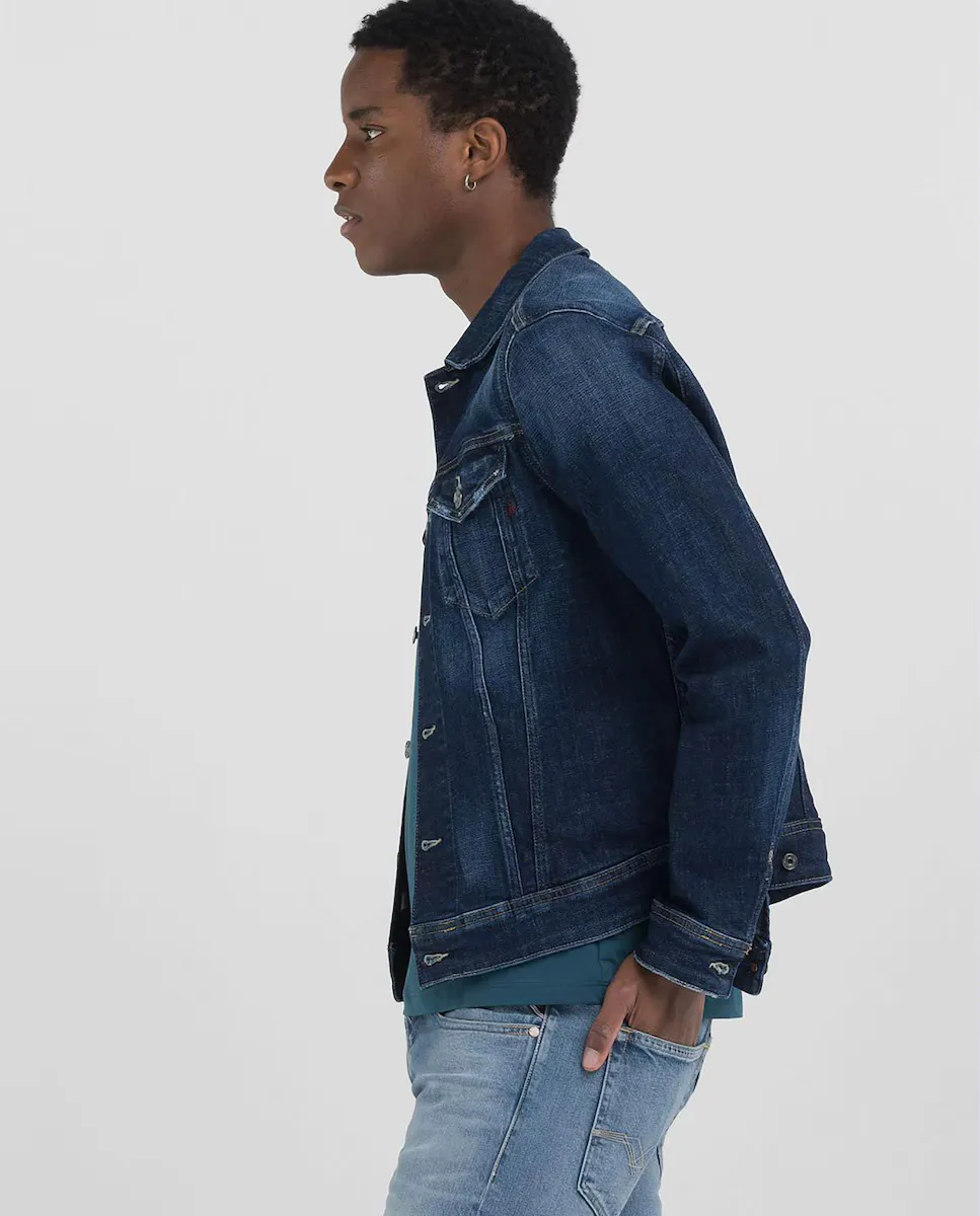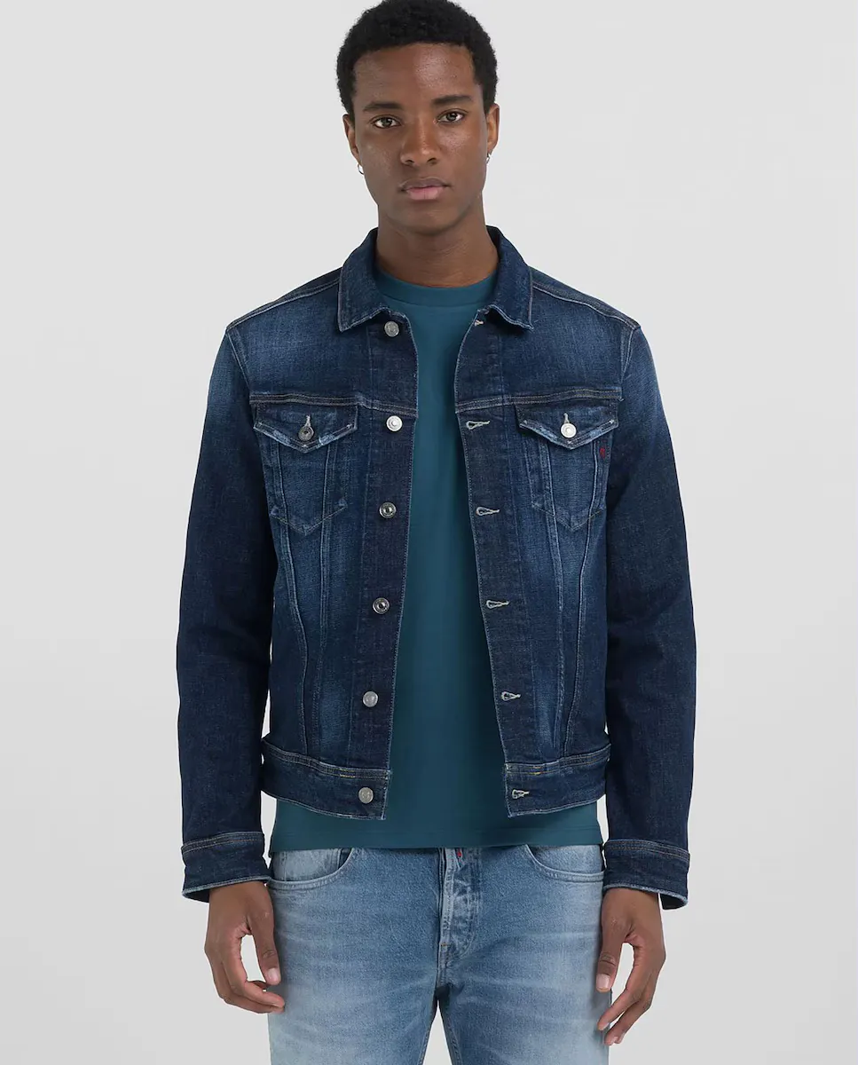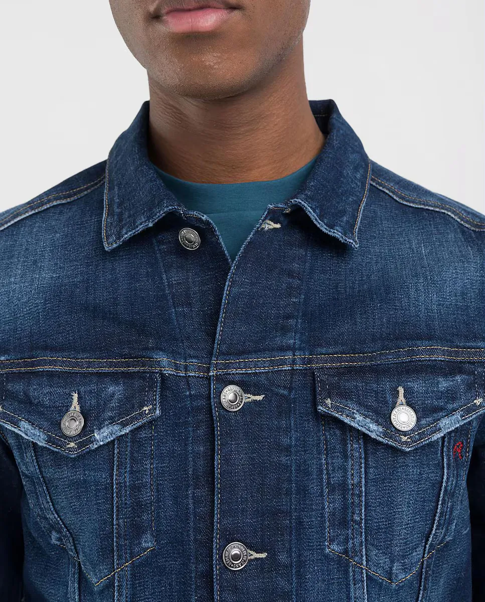 Универсальная куртка, сшитая из синего денима с эффектом стрейч 12 унций, обработанная 5 лет с темным оттенком стирки и финальной сушкой на манекене. Модель имеет мелкие локализованные разрывы, а также ручную шлифовку и абразивные повреждения на воротнике, манжетах и карманах, что создает выраженные цветовые контрасты в местах износа денима. Практичные кнопочные карманы спереди, боковые карманы, регулируемые застежки на нижней части и передняя застежка завершает этот джинсовый куртку для мужчин. На одном из двух накладных карманов вышит культовый логотип R, а на задней стороне находится индивидуальная бирка с надписью Replay.