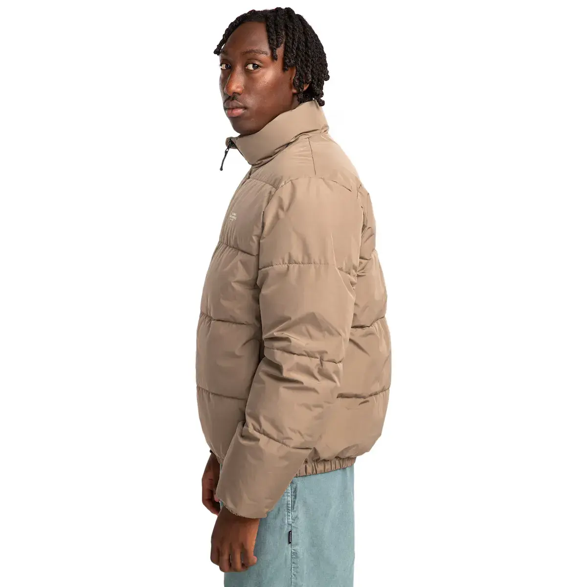 Пуховик для мужчин. Характеристики включают: Коллекция: основная коллекция. Ткань: 100% переработанный полиэстер (95 г/м2). Технология: без PFC. Водоотталкивающие свойства: долговременная водоотталкивающая обработка [DWR] 5K для вашей защиты. Крой: обычный. Воротник: высокий воротник. Рукава: длинные рукава. Утеплитель: переработанный утеплитель из шариков. Застежка: молния с защитной планкой внутри. Карманы: 2 кармана на молнии спереди. 1 карман внутри на груди. Внутренняя ткань: подкладка из полиэстерового тафта. Бренд: принт на груди. Другие характеристики: эластичный подол и манжеты. Теплоизоляция и защита от ветра.