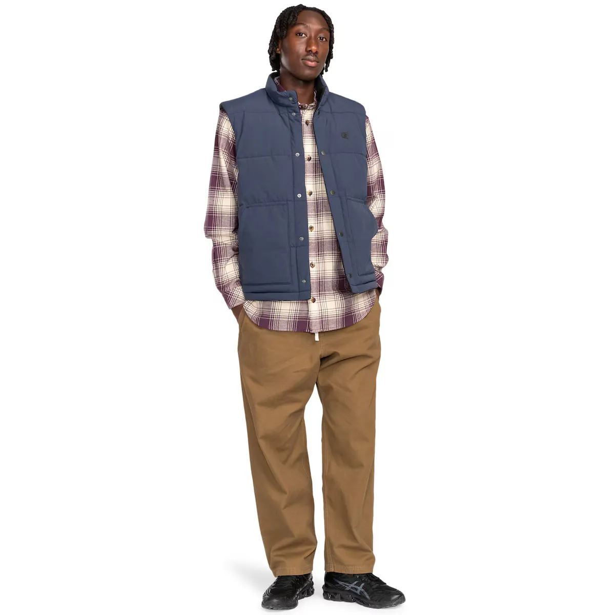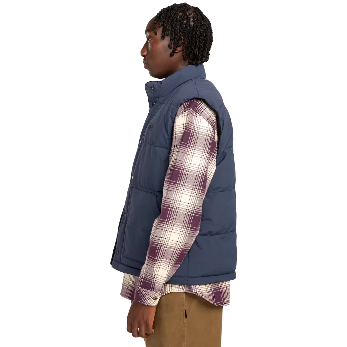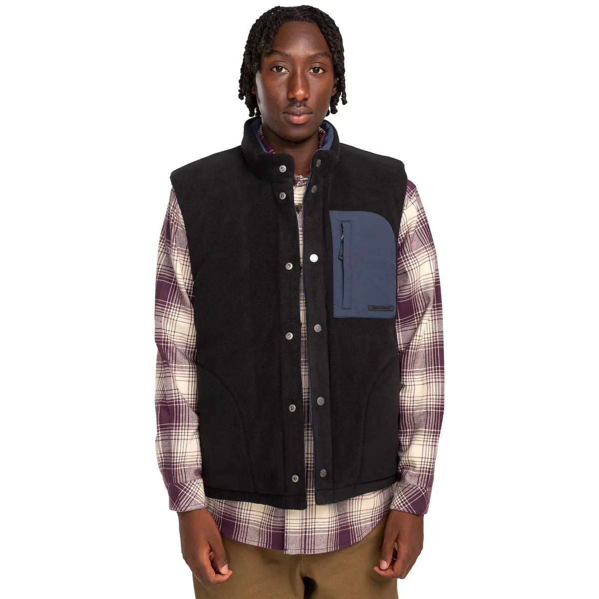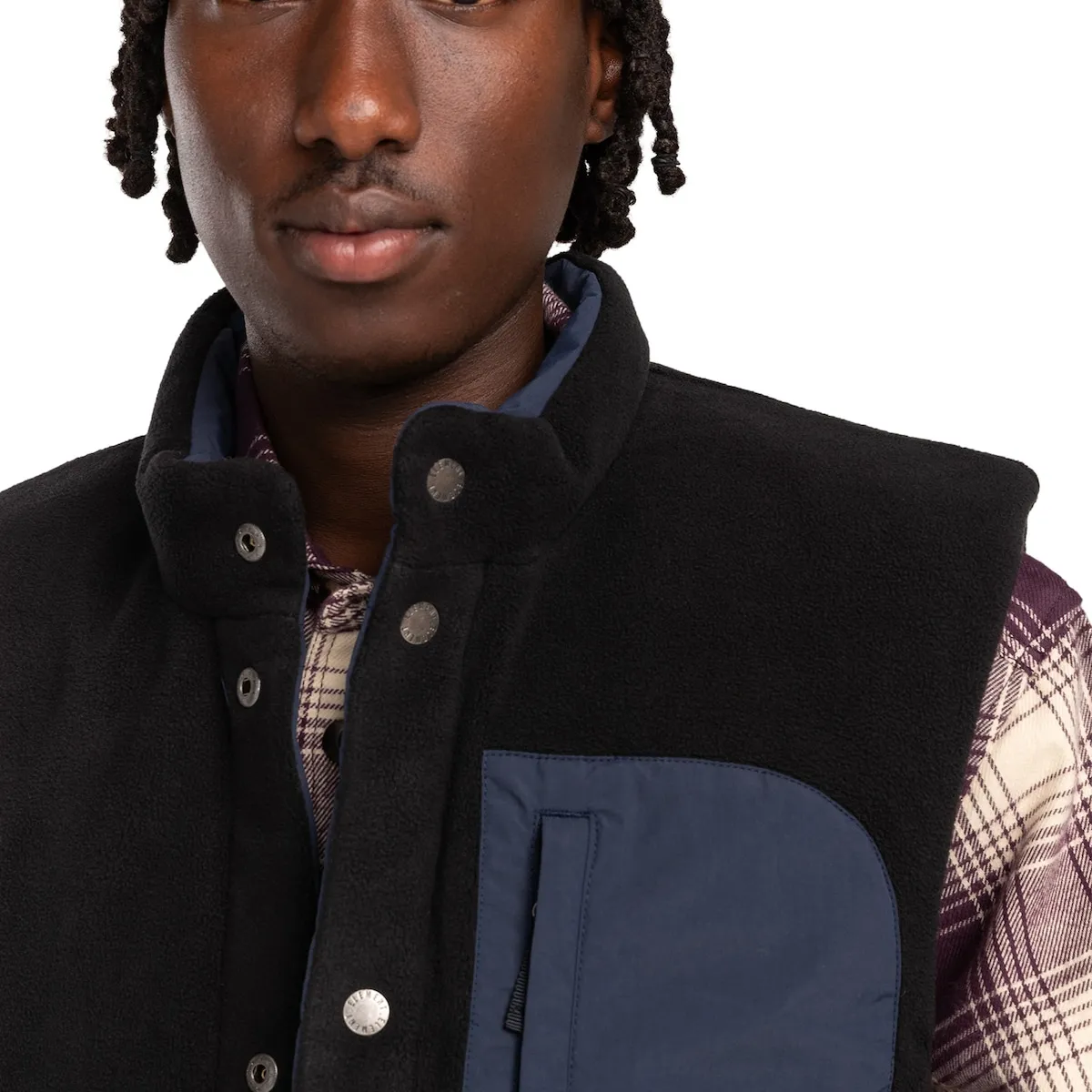 Реверсивный утепленный жилет для мужчин. Особенности: Коллекция: основная коллекция. Ткань: саржа из 100% переработанного нейлона [139 г/м2]. Технология: без PFC. Водонепроницаемость: долговечная водоотталкивающая обработка [DWR] 5K для вашей защиты. Крой: свободный. Воротник: высокий воротник. Рукава: без рукавов. Наполнитель: полиэфирный наполнитель. Застежка: застежка на пуговицах. Карманы: два передних накладных кармана с тассоном. Карманы на молнии на груди. Карман для рук на шерпе. Подкладка: флис из полиэстера. Бренд: силиконовая нашивка на груди. Другие особенности: реверсивная модель.
