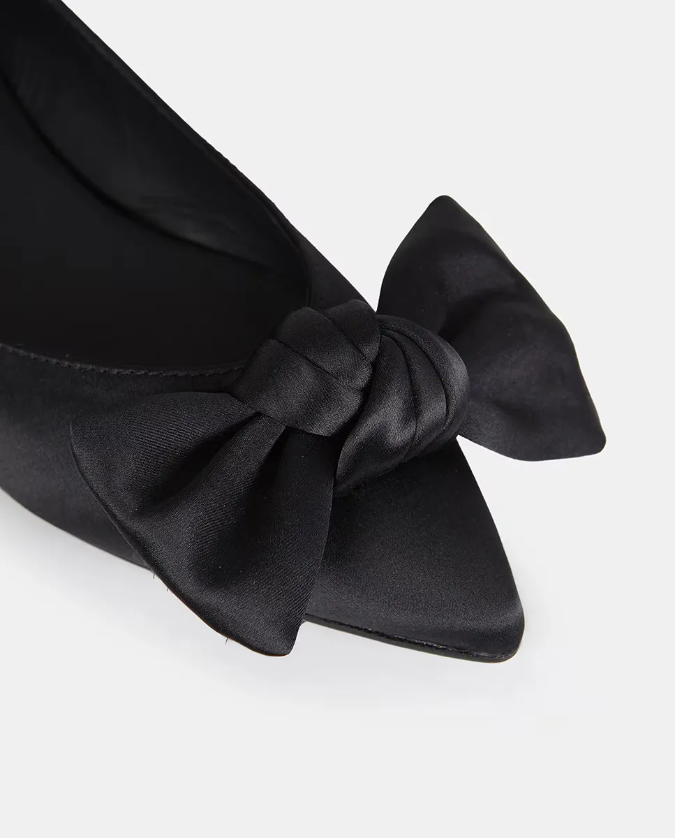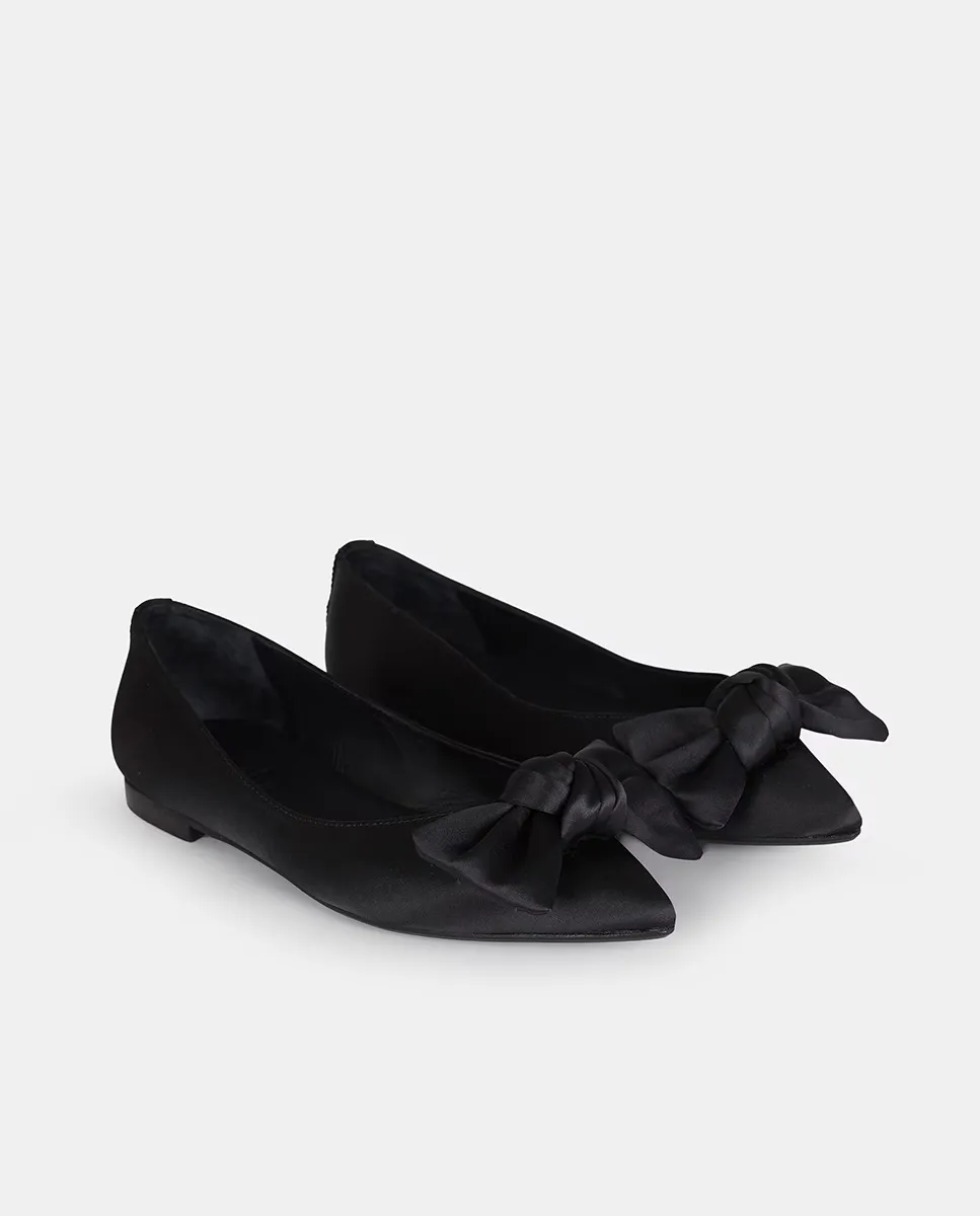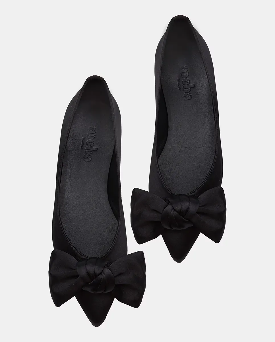 Чёрные сатиновые балетки с ручным бантом. Подкладка и стелька из козьей кожи. Высота каблука 1 см.