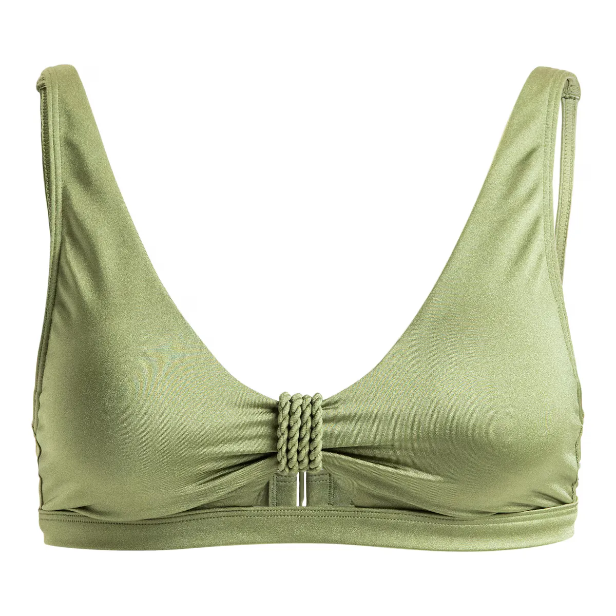 Топ бикини средней степени покрытия для женщин. Характеристики включают: Коллекция: Коллекция Brihlo, Ткань: Лоснящаяся, эластичная, мягкая, прочная, переработанная, смесь 82% переработанного нейлона и 18% эластана, Дизайн: бралетт в форме треугольника, Вырез: V-образный вырез, Поддержка: обычная поддержка, Уплотнение: съемные прокладки, Ремешки: регулируемые ремешки с кольцами и ползунками, Застежка: крючок с 3 отверстиями для выбора различных типов застежки, Покрытие: среднее покрытие, Размер чашки: лучше всего подходит для чашки A/B/C и Бренд: резиновая нашивка ROXY.