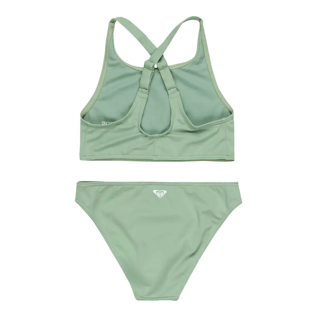 Комплект купальника из двух частей для детей (6 - 16 лет). Характеристики: Коллекция: коллекция Active Rg, Ткань: мягкая, переработанная, прочная и эластичная из 82% переработанного полиэстера и 18% эластана, Технология: устойчива к хлору, Дизайн: комплект с укороченным топом, Вырез: круглый вырез, Подкладка: съемная подкладка в размерах 12-16 лет, Ремешки: регулируемые ремешки с кольцом и скользящим элементом, Покрытие: полное покрытие, Застежка: фиксированная застежка, Бренд: резиновый принт Roxy на передней части и резиновый принт Roxy с сердцем внизу.