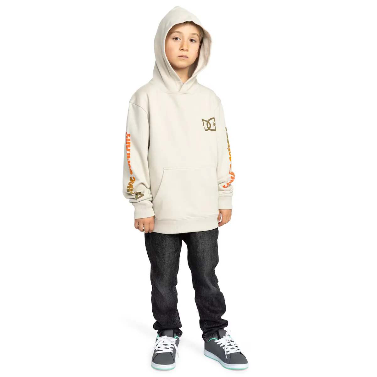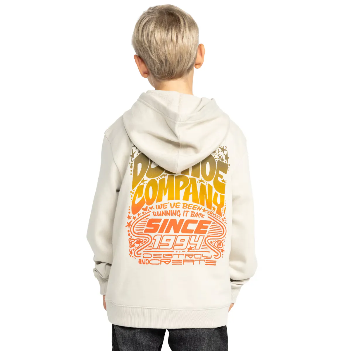 Толстовка с капюшоном для детей 8 - 16 лет. Характеристики включают: Ткань: французский терри средней плотности с полубрашированным обратом, смесь 55% обычного хлопка, 25% переработанного хлопка и 20% переработанного полиэстера [280 г/м2], Крой: обычный крой, Воротник: капюшон с воротником, Рукава: длинные рукава, Застежка: без застежки, Карманы: карманы в стиле кенгуру, Бренд: принт на левой стороне груди, спине и обеих рукавах, Шнурки плоские с кончиками и металлическими люверсами и Другие особенности: вшитая тесьма на задней стороне воротника.