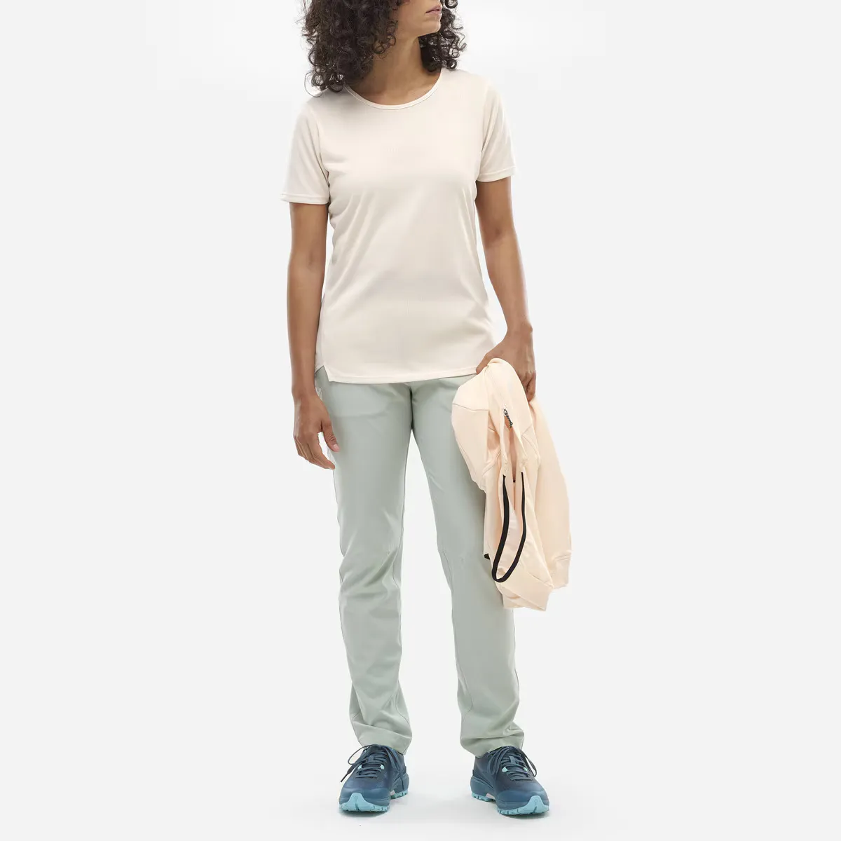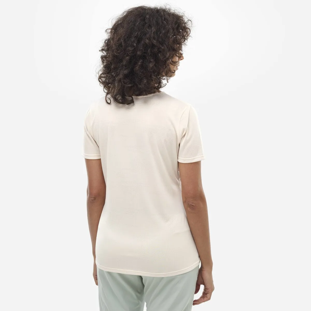 Легко передвигайтесь в этой женской футболке. Она эластичная, изготовлена из полиэстера, что способствует отведению влаги. Также она эстетична благодаря дизайнам гор, которые появляются на жаккардовой ткани по всей футболке.