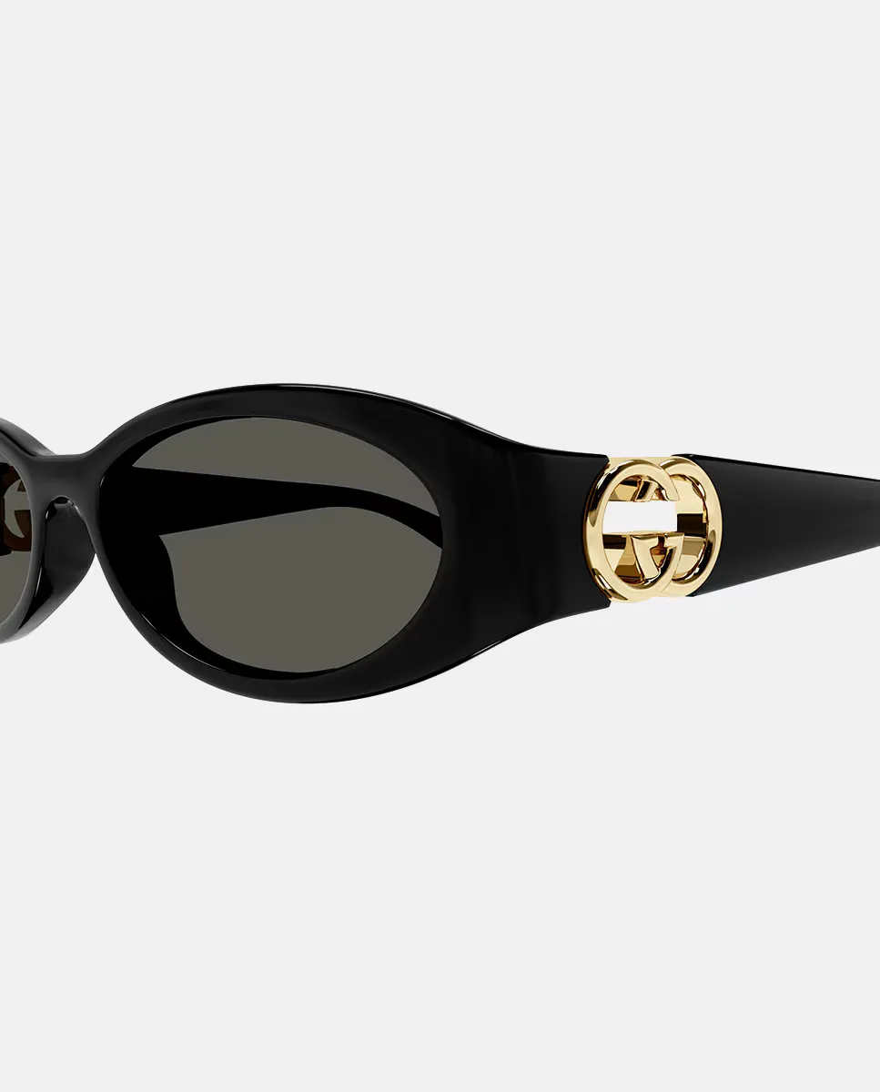 Складные солнцезащитные очки, вдохновленные архивом с логотипом переплетенных GG, перфорированным на дужках. Дизайн в форме миндаля, женский винтаж. Функциональный логотип GG на шарнире. Яркая и молодежная цветовая палитра.