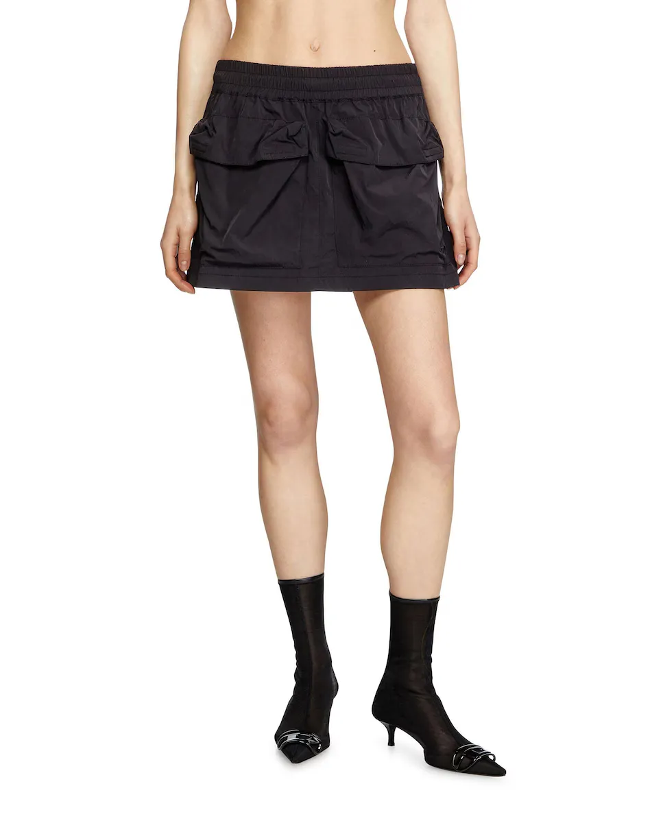 Передняя часть с смелыми карманами добавляет утилитарный штрих к этой мини-юбке для женщин. Она изготовлена из компактного мято-го нейлона и имеет эластичный пояс с шнурком. Вышитый логотип Oval D придаёт ей тонкий шарм.