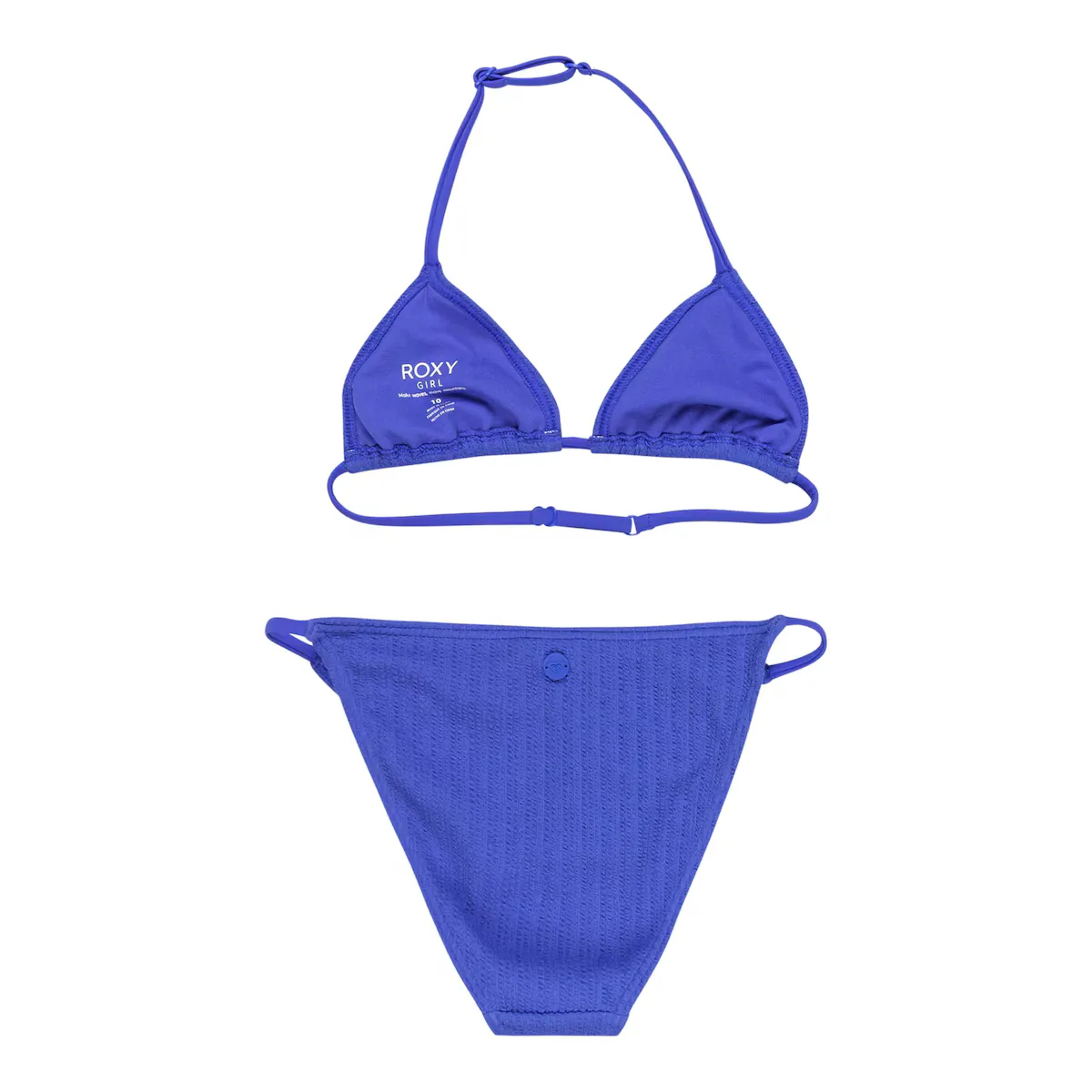 Комплект купальных принадлежностей из двух частей для детей (от 6 до 16 лет). Характеристики включают: Коллекция: Коллекция Aruba RG, Ткань: трубчатая, мягкая, прочная и эластичная, смесь 92% переработанного полиэстера и 8% эластана, Дизайн: комплект трико, Воротник: V-образный вырез, Подкладка: съемная подкладка для размеров 12-16 лет, Регулировка: регулируемые ремешки с кольцом и бегунком, Застежка: застежка с кольцом и бегунком, Покрытие: среднее покрытие и Бренд: резиновая метка Roxy с сердцем.