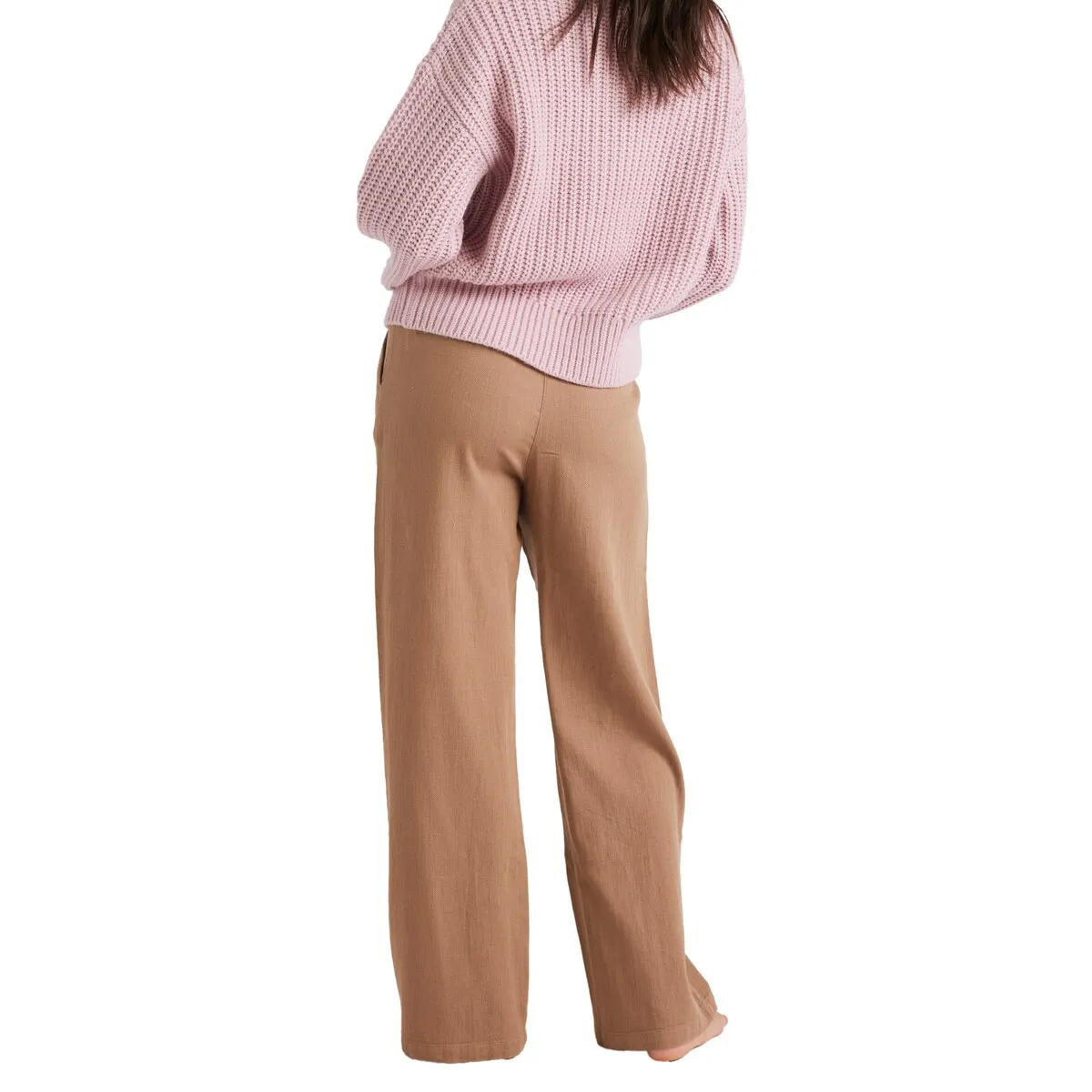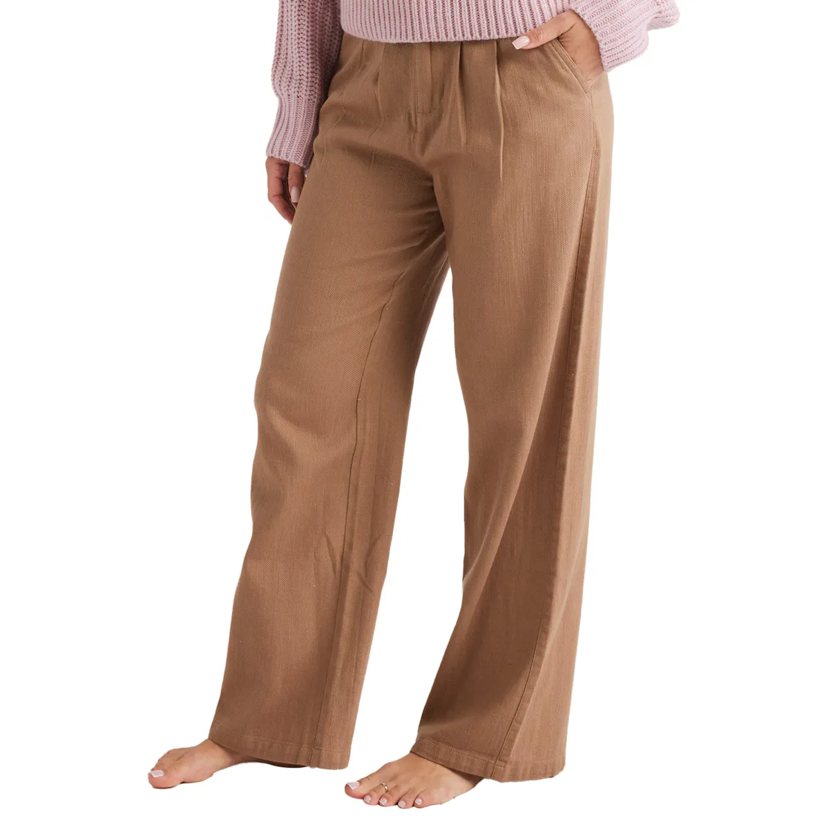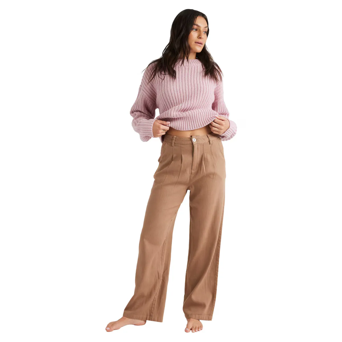 Чиносы для женщин. Характеристики включают: Ткань: Дабби из хлопка с неравномерным нитяным составом средней плотности (200 г/м²), Крой: Свободный силуэт, Ноги: Широкие ноги, Молния: Передняя молния с застежкой, Пояс: Средняя талия, Обхват талии: Фиксированный пояс, Застежка: Металлическая пуговица Roxy, Карманы: Передние карманы по диагонали, Задние карманы, Бренд: Тональная вышивка с логотипом Roxy на заднем кармане, Другие детали: Дартсы на передней части и задние детали с цилиндрическим кантом.