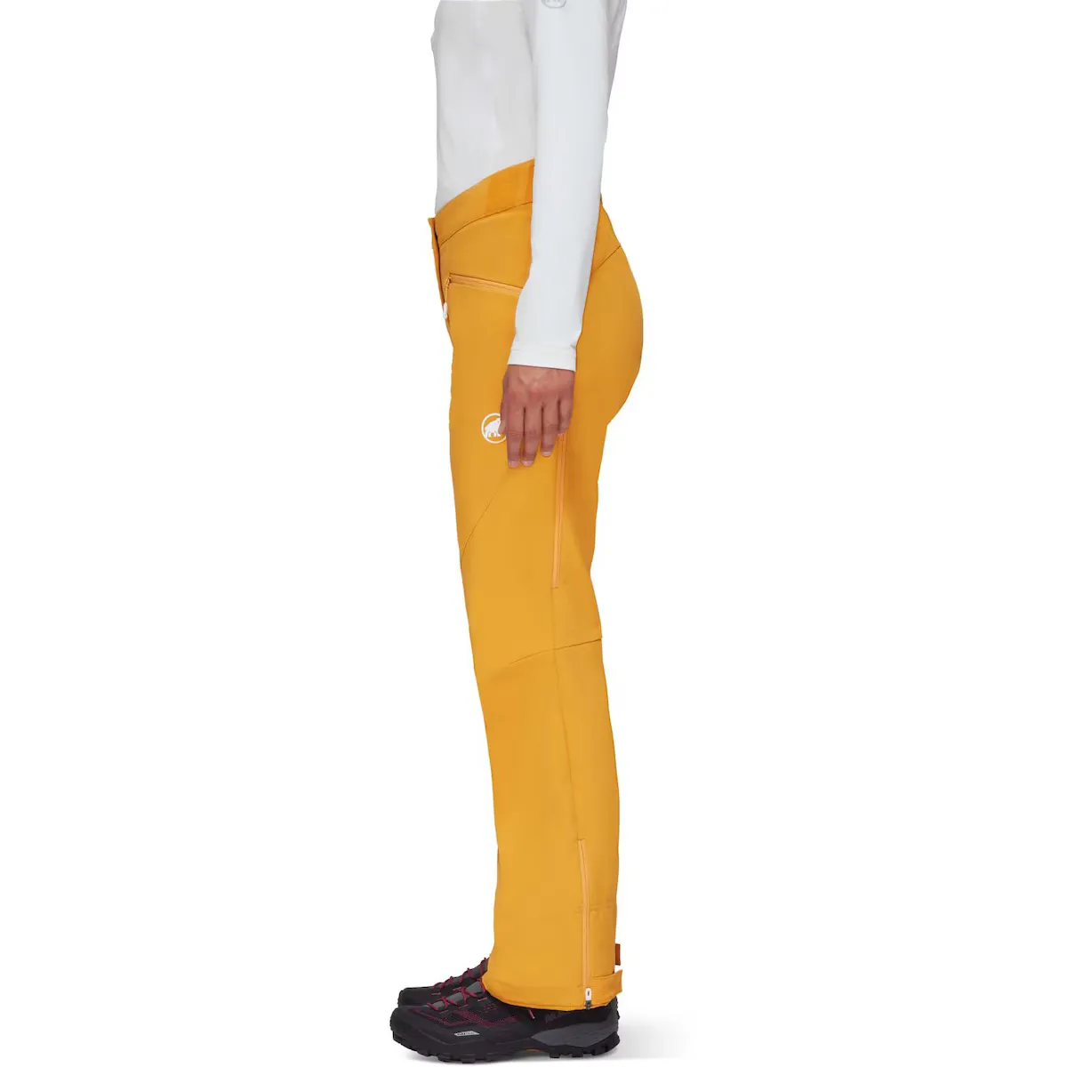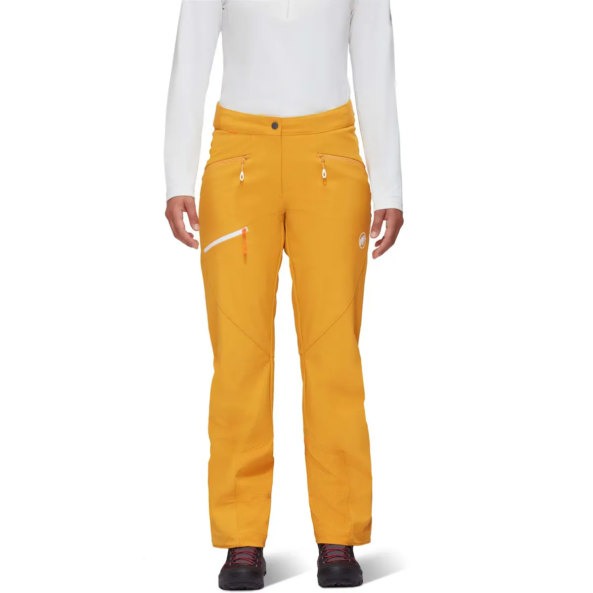 Эластичный, прочный и водоотталкивающий материал софтшелл с мембраной, Поднятая задняя талия, Специальная широкая талия для идеальной посадки: можно регулировать снаружи, 2 передних кармана с молниями, совместимыми с альпинистским снаряжением, Карман для карт с интегрированным креплением, Боковая вентиляция с молнией и защита от снега из сетчатого материала, Защита краев и кошек из долговечного материала Cordura, Встроенные регулируемые гамаши, Ширина ноги регулируется благодаря молнии и кнопке.