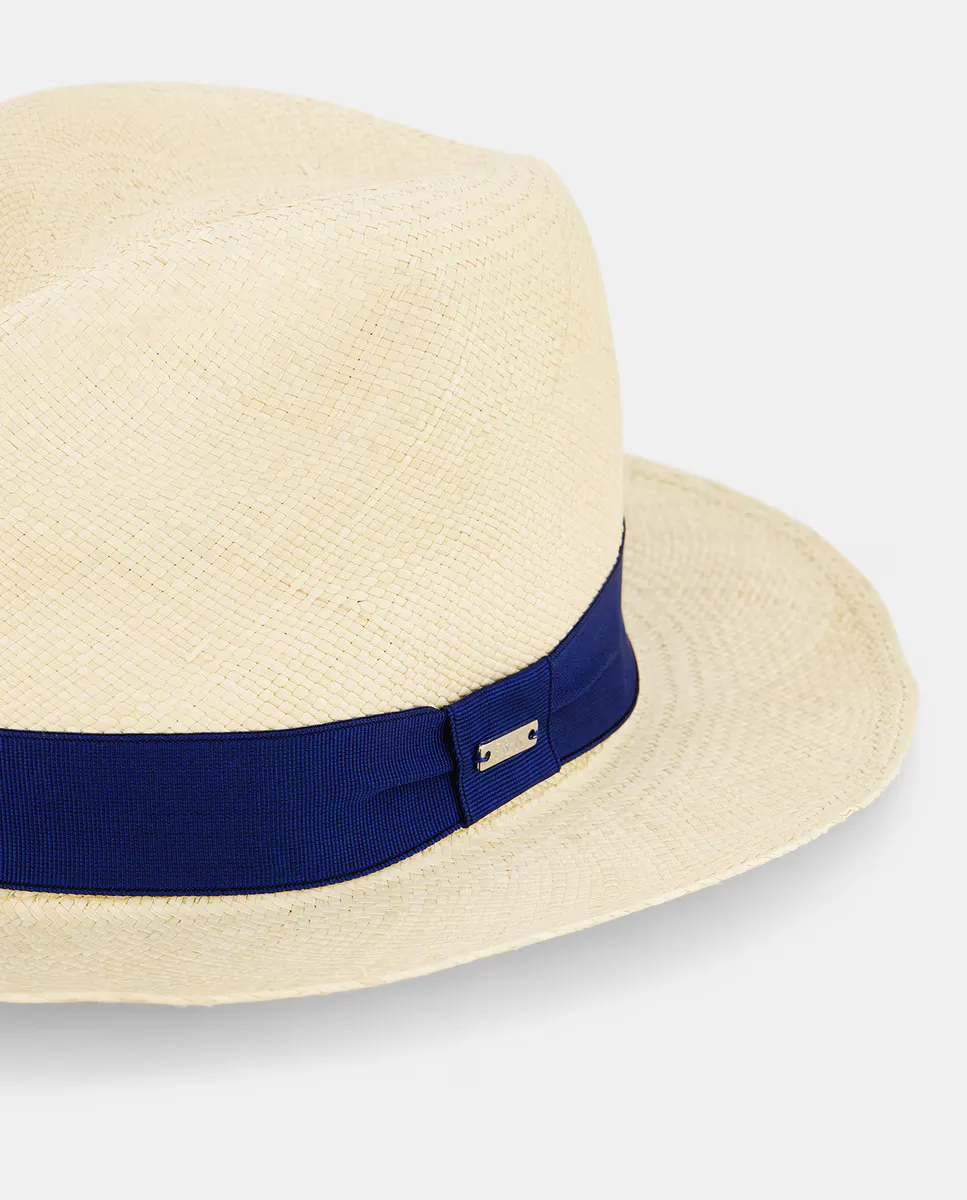 Панама Модело Амура. Панамский федорский стиль, шляпа Амура изготовлена из вручную ткёного материала, называемого Брисса 3. Она украшена лентой королевского синего цвета, которая обрамляет её авокадо-корону. Поля с натуральной отделкой. Изготовлена вручную мастерами, шляпа имеет усилитель из силикона в области короны, чтобы защитить её от сжатия пальцами, обеспечивая таким образом большую долговечность. Кроме того, она оснащена внутренней подкладкой, что делает её очень удобной.