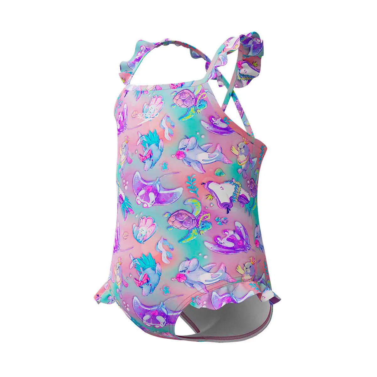 Соревнуйтесь с волнами! Наш очаровательный розовый и фиолетовый купальник создан для удовольствия во время отпуска. Подводная сцена привлекает молодых плавцов, а удобные перекрестные бретели надежно фиксируются.