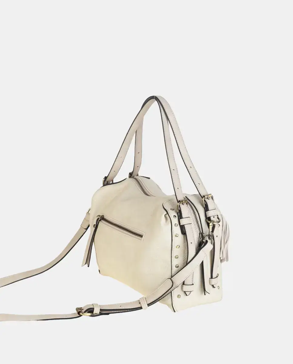 Сумка ручной работы в стиле боллин, выполненная из очень мягкого PU, в сочетании с PU того же цвета для ручек и деталей. Эта модель имеет повседневный вид благодаря переднему украшению из бахромы, выполненной из замши того же цвета, и боковым расширениям, обрамленным заклепками, что придает неформальный вид. Задняя часть имеет металлическую застежку-молнию, как и основное открытие. Модель можно носить как через плечо, так как предусмотрена дополнительная ручка.